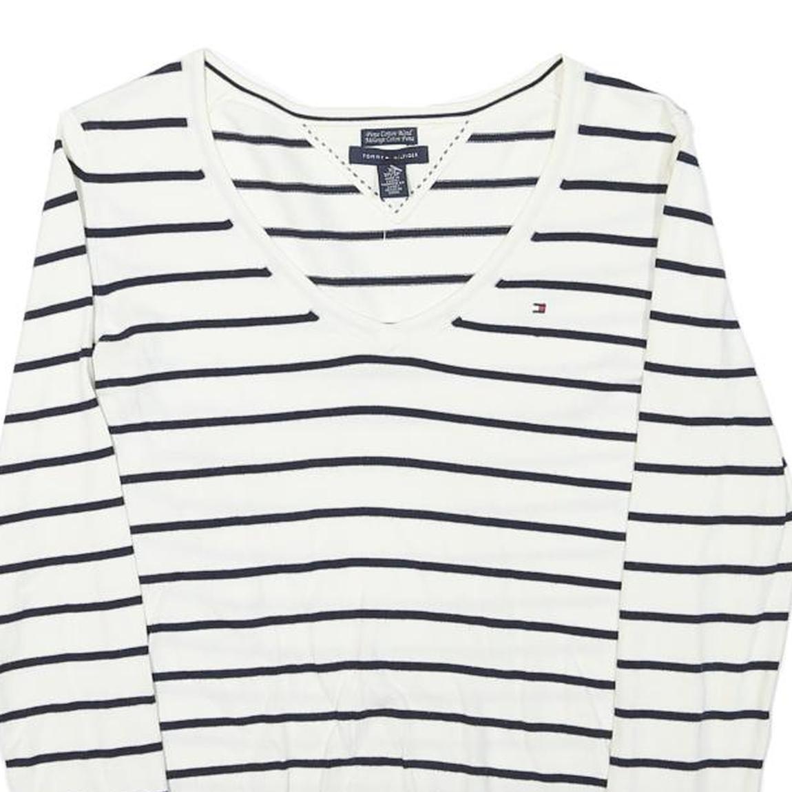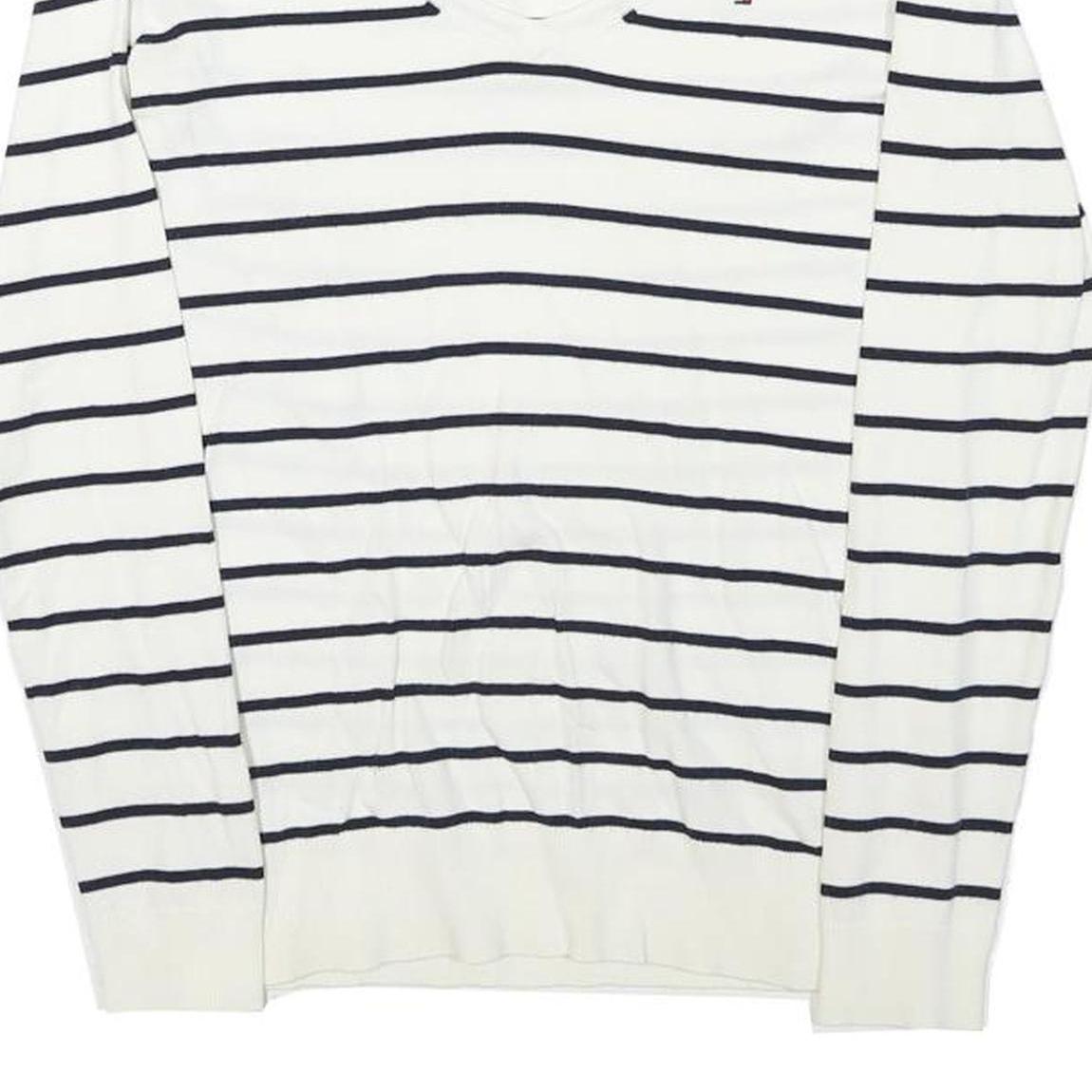 TOMMY HILFIGER Womens White & Navy Striped Jumper V-Neck Basic Knit XS Classic