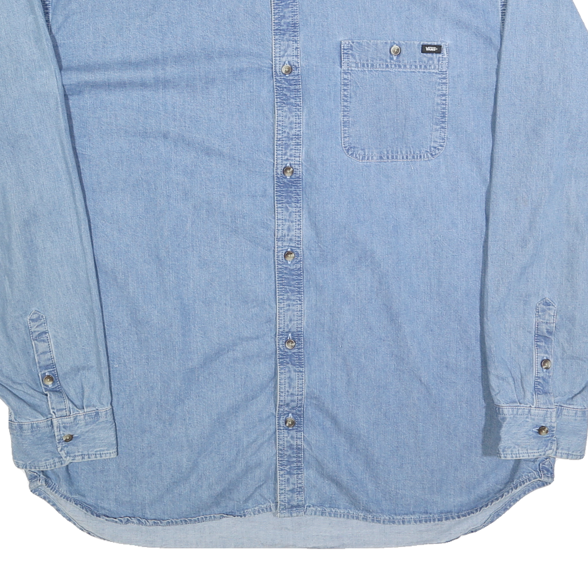 This VANS mens shirt features a light blue denim cotton body complemented by a contrasting beige checkered collar, adding a touch of distinctive style to a classic silhouette. A single chest pocket with a subtle VANS label is visible on the front, enhancing its casual vibe. The shirt has a relaxed fit with long sleeves and buttoned cuffs, ideal for layering or standalone wear.