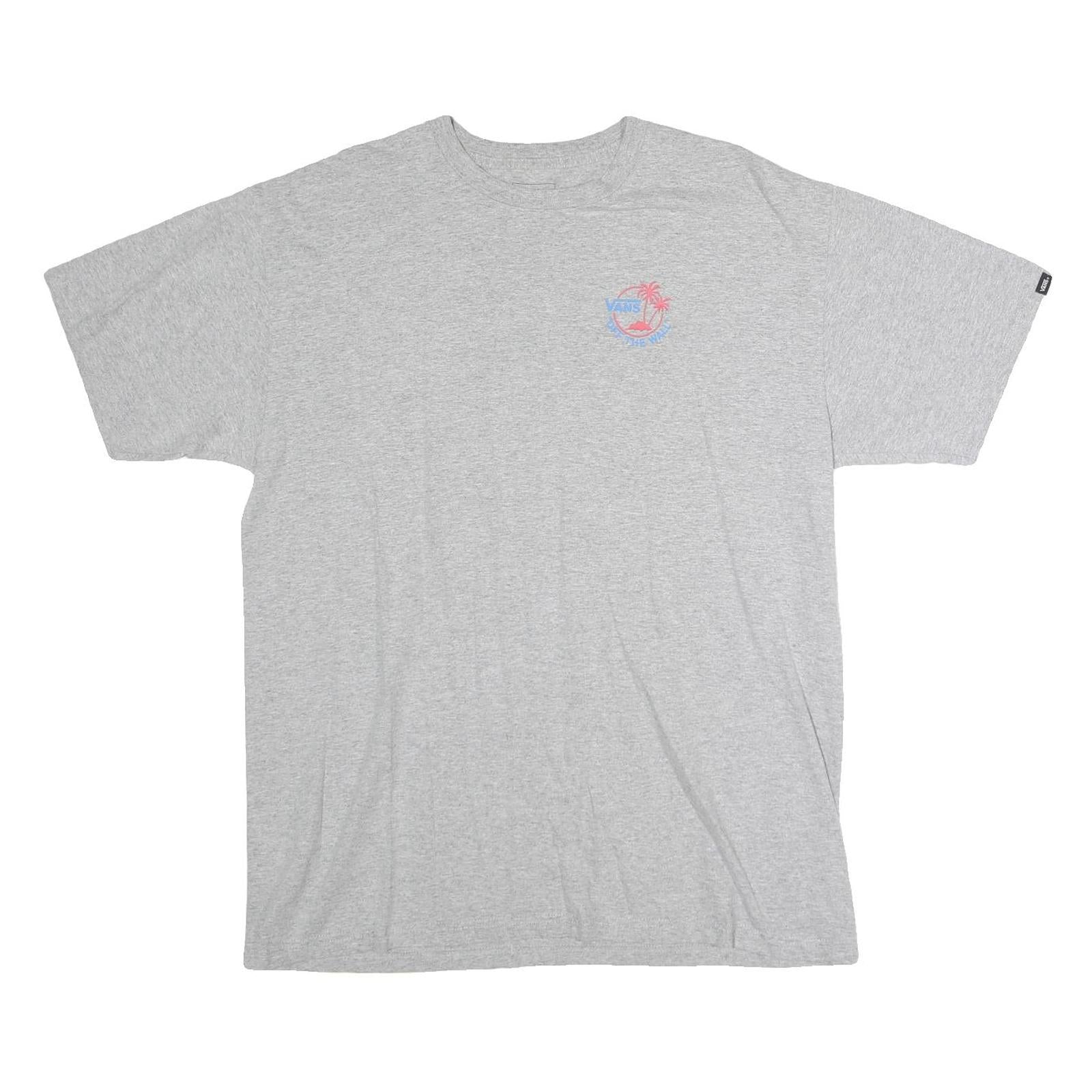 This VANS Mens T-Shirt features a light grey base colour with a small chest graphic in blue and pink showing the VANS logo alongside palm trees and an island, giving it a tropical theme. The back showcases a larger matching graphic with the same logo and "Off The Wall" text beneath a circular design.