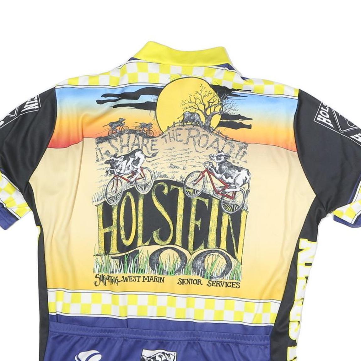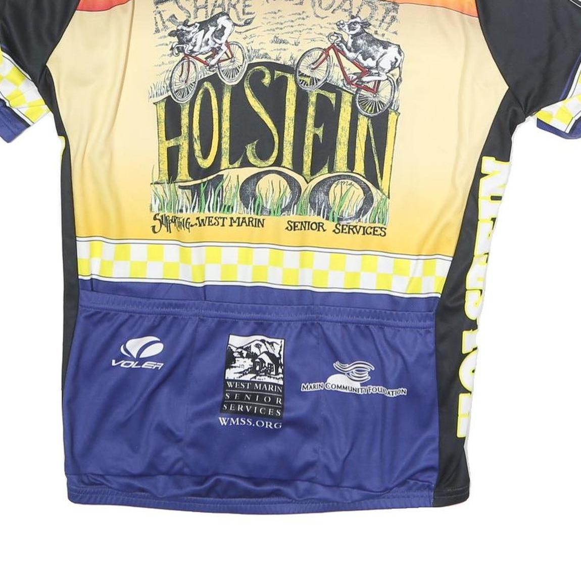 This Volea men's cycling T-shirt features a vibrant blue, black, and yellow colour scheme with eye-catching graphics of cows riding bicycles and the word "Holstein" prominently displayed on the front and sleeves. A yellow and white checkerboard pattern adds contrast around the chest and sleeves. The back showcases a sunset scene with additional cow riders and various sponsor logos.