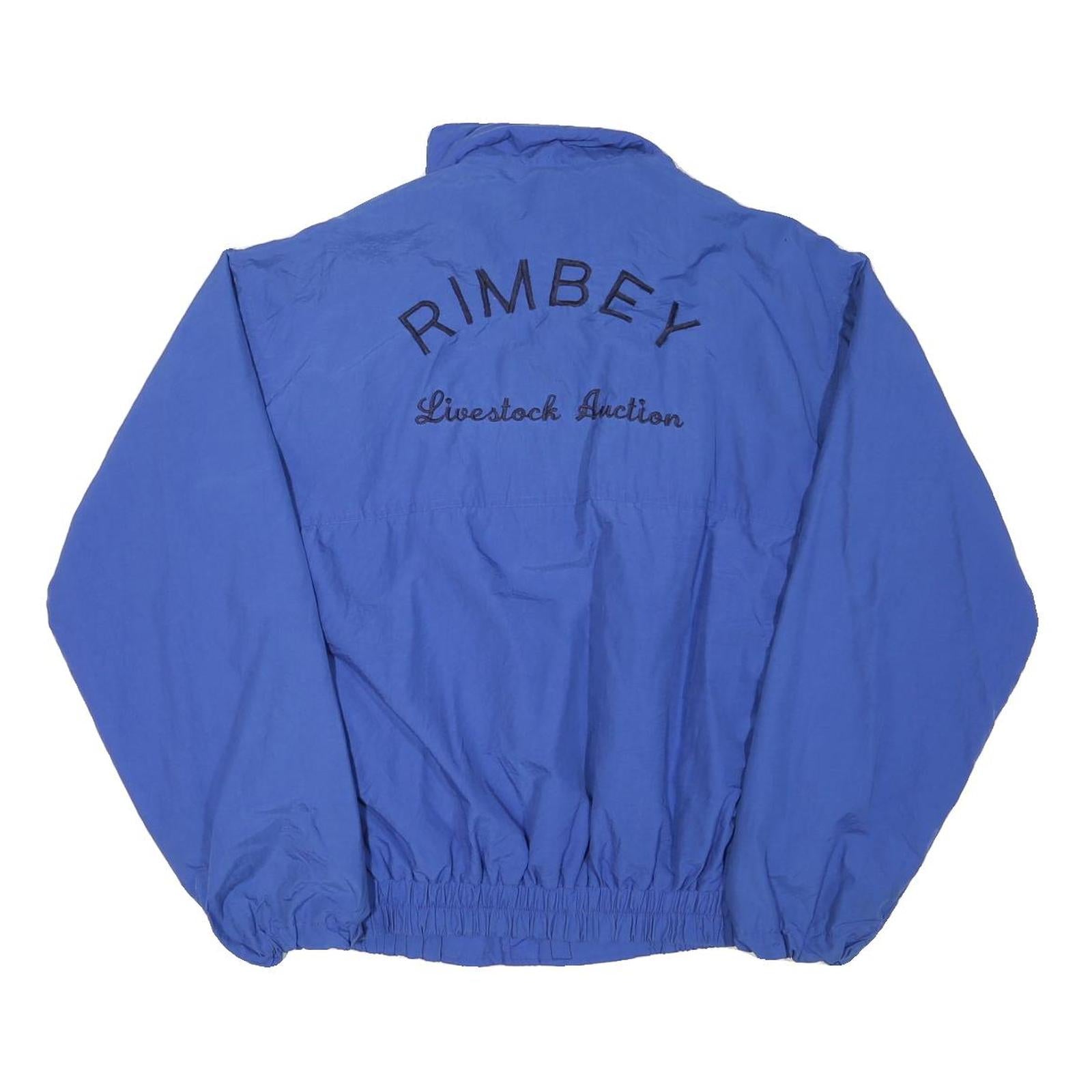 This men’s jacket features a striking blue color crafted from a durable polyester blend fabric, offering both comfort and resilience. The front and back are embroidered with the text 'RIMBEY Livestock Auction' in black, making it a unique piece with subtle branding. It is designed with a zip closure and elasticated cuffs and hem for a secure, tailored fit.