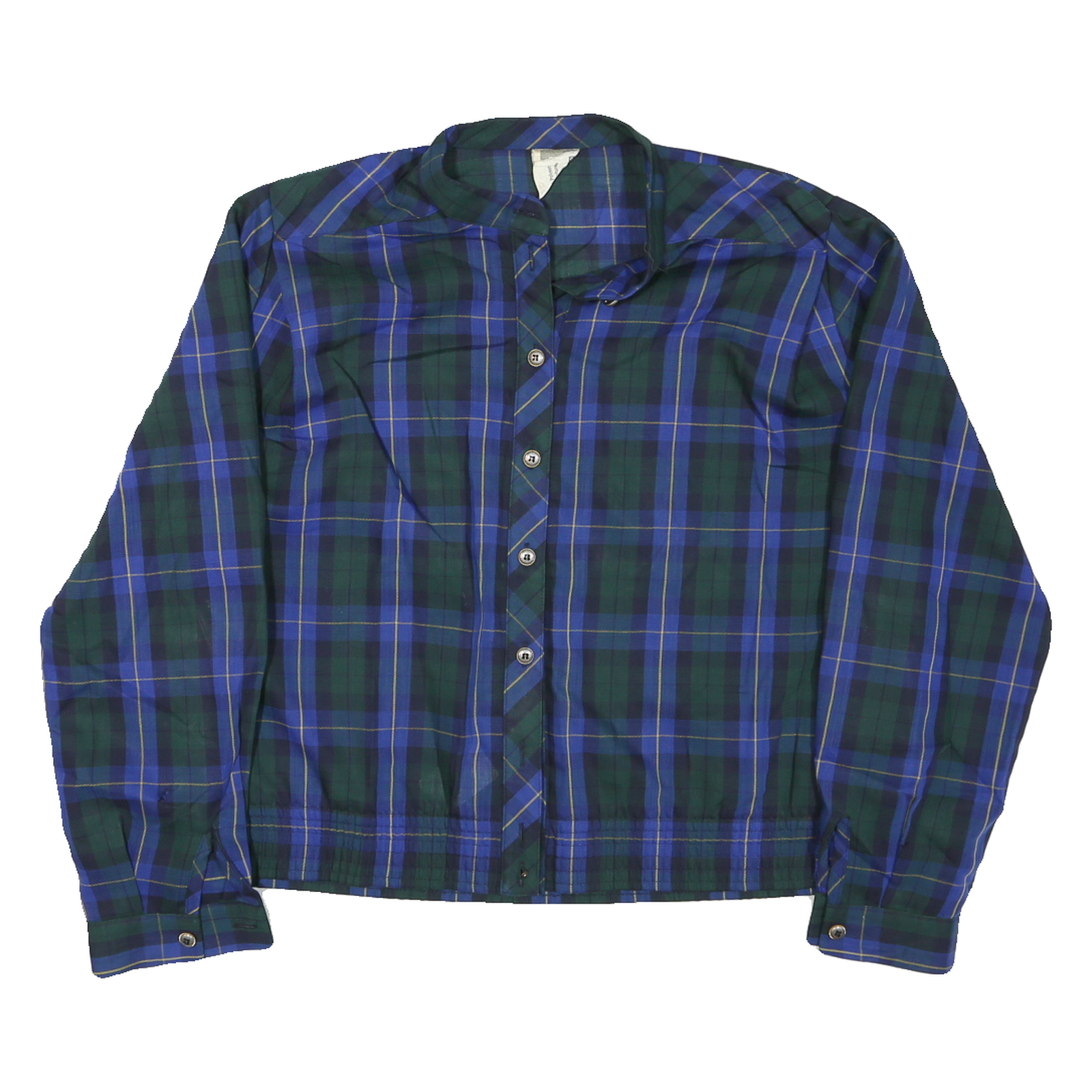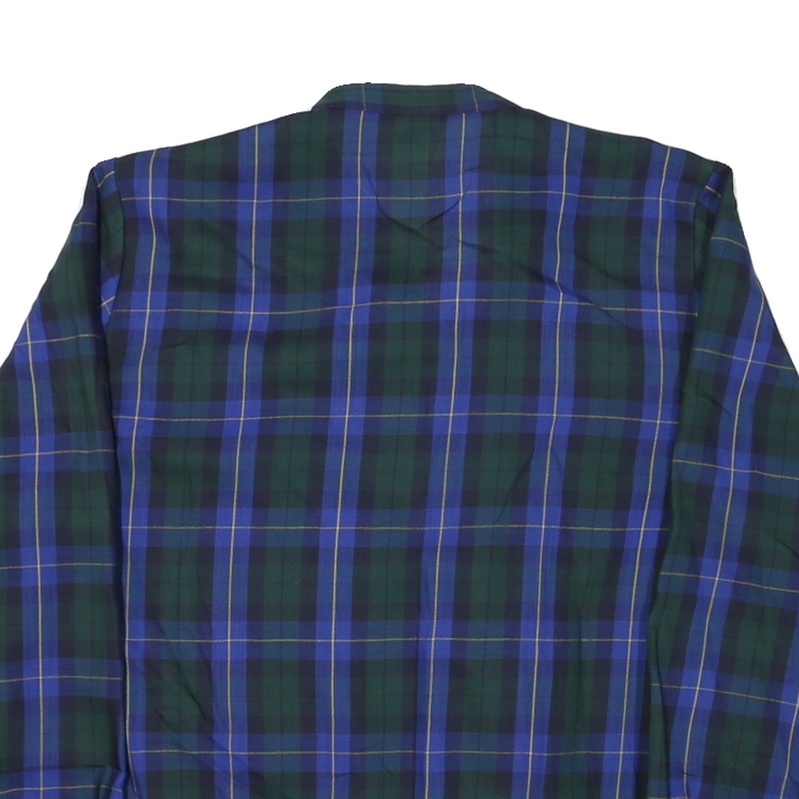 This womens jacket showcases a classic check pattern in blue and green with subtle yellow accents, delivering a timeless and versatile look. It features a band collar and button closure for a clean and smart finish.