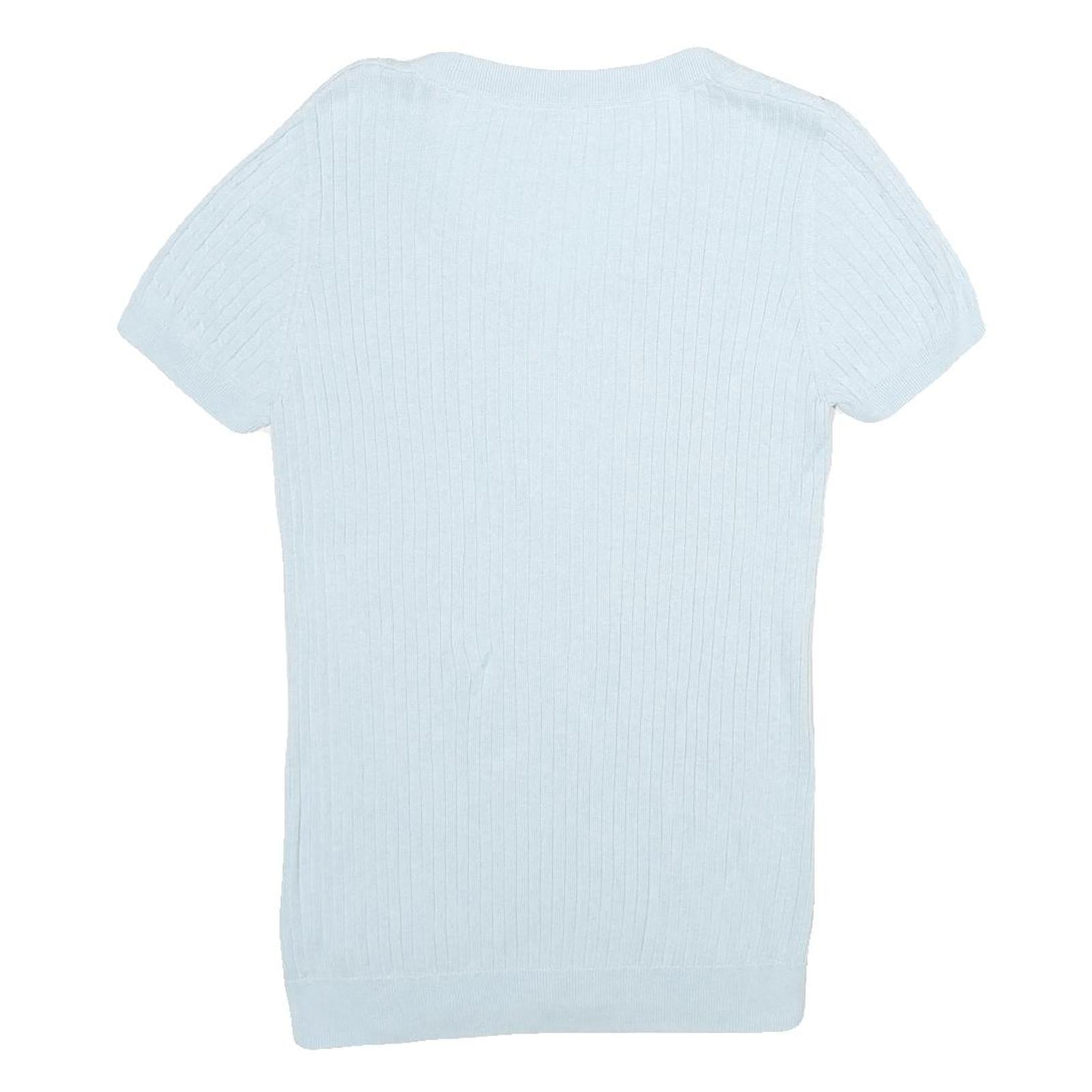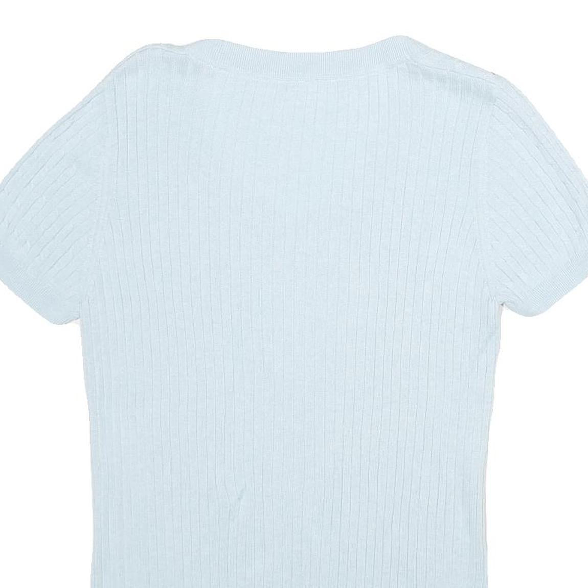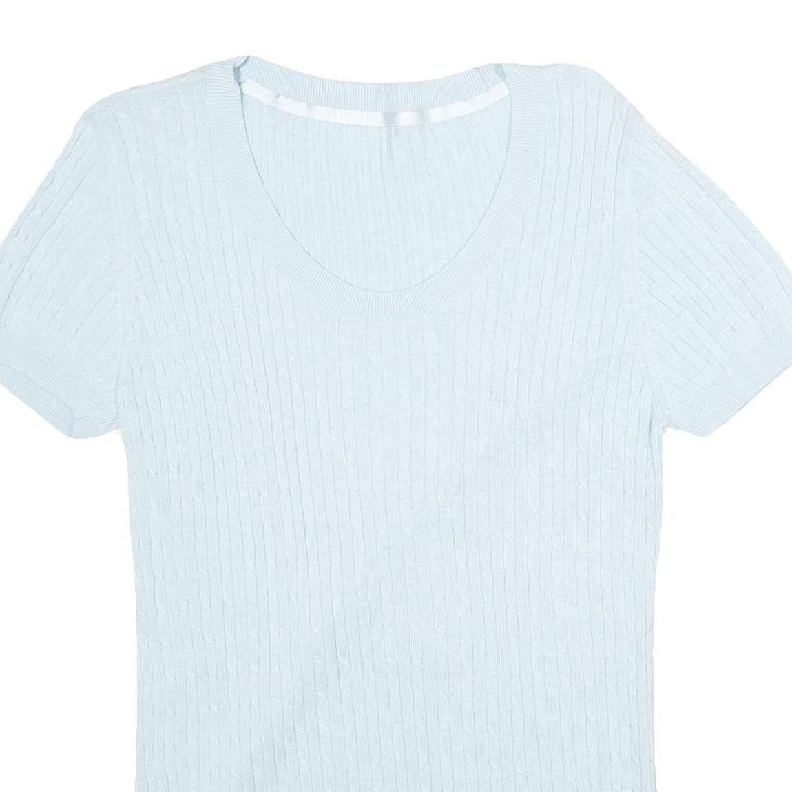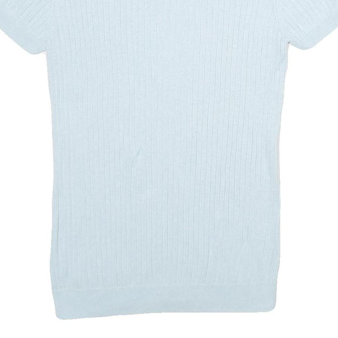 This women's jumper features a delicate blue colour in a plain, subtle ribbed pattern. The knit is fine and soft, creating a lightweight and comfortable garment suitable for layering or standalone wear. It has a flattering V-neckline and short sleeves contributing to a casual yet polished look.