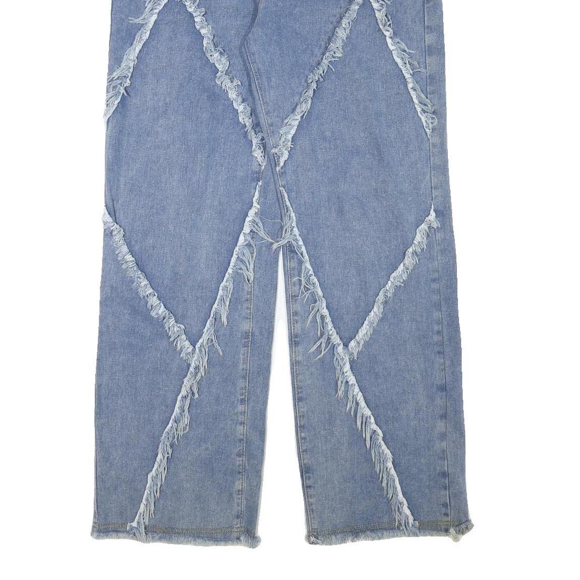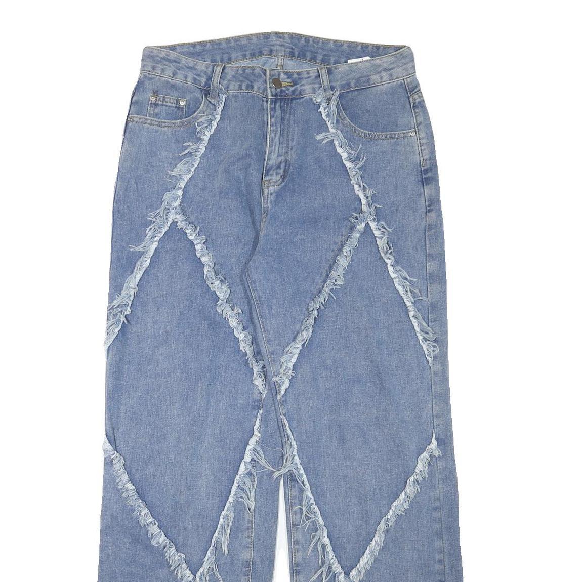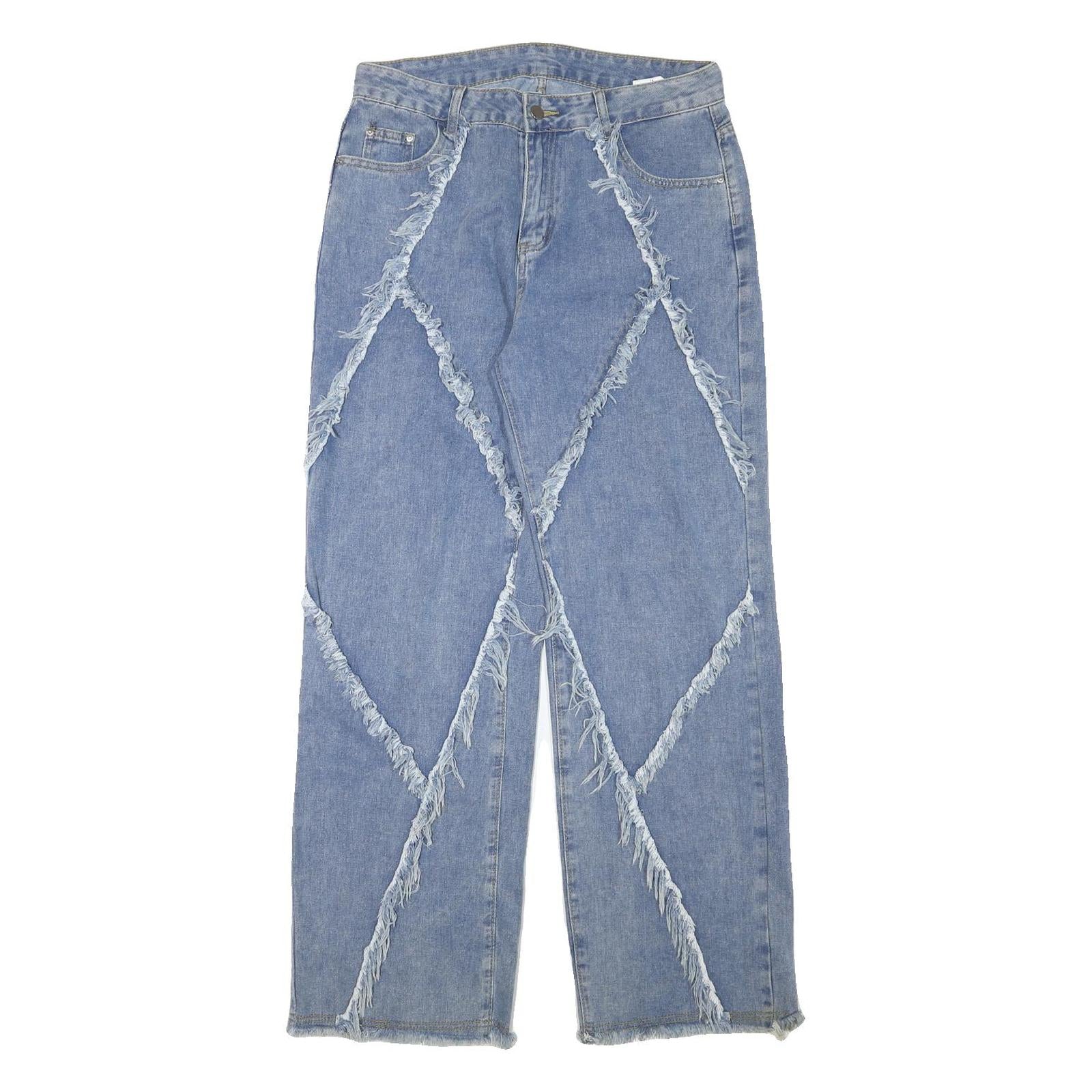 These womens jeans feature a light blue denim fabric with distinctive frayed panel detailing forming large diamond shapes on the front. The relaxed fit provides comfortable wear with a straight leg cut and a high rise. The jeans have a classic five-pocket design with rivet accents and a zip closure for ease of wear.