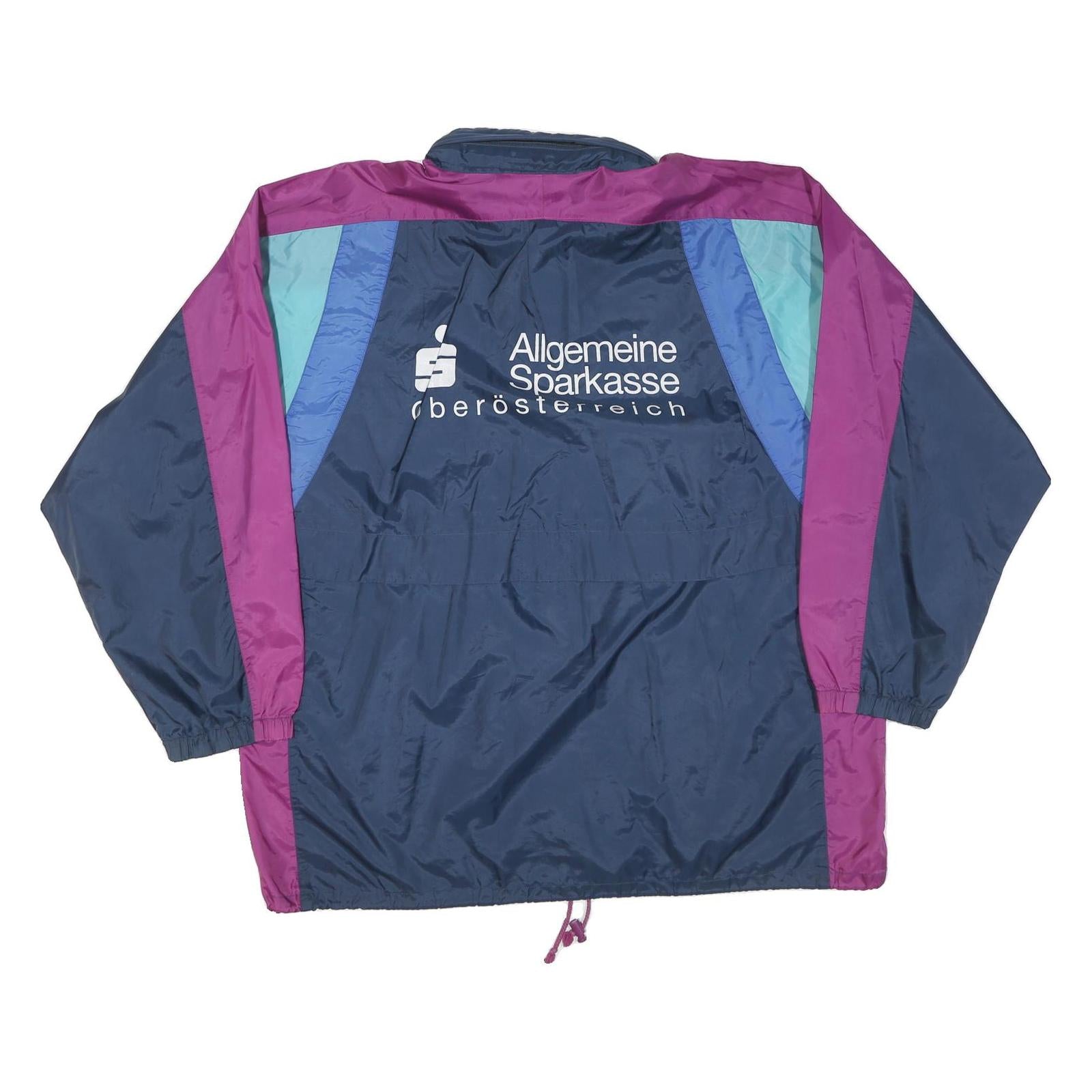 The jacket has elasticated cuffs and a drawstring hem for adjustable styling and fit. On the back, notable white printed branding reads "Allgemeine Sparkasse Oberosterreich" alongside a logo, adding an authentic touch. The fit is relaxed and roomy in size XL, making it a versatile piece for layering or everyday use.