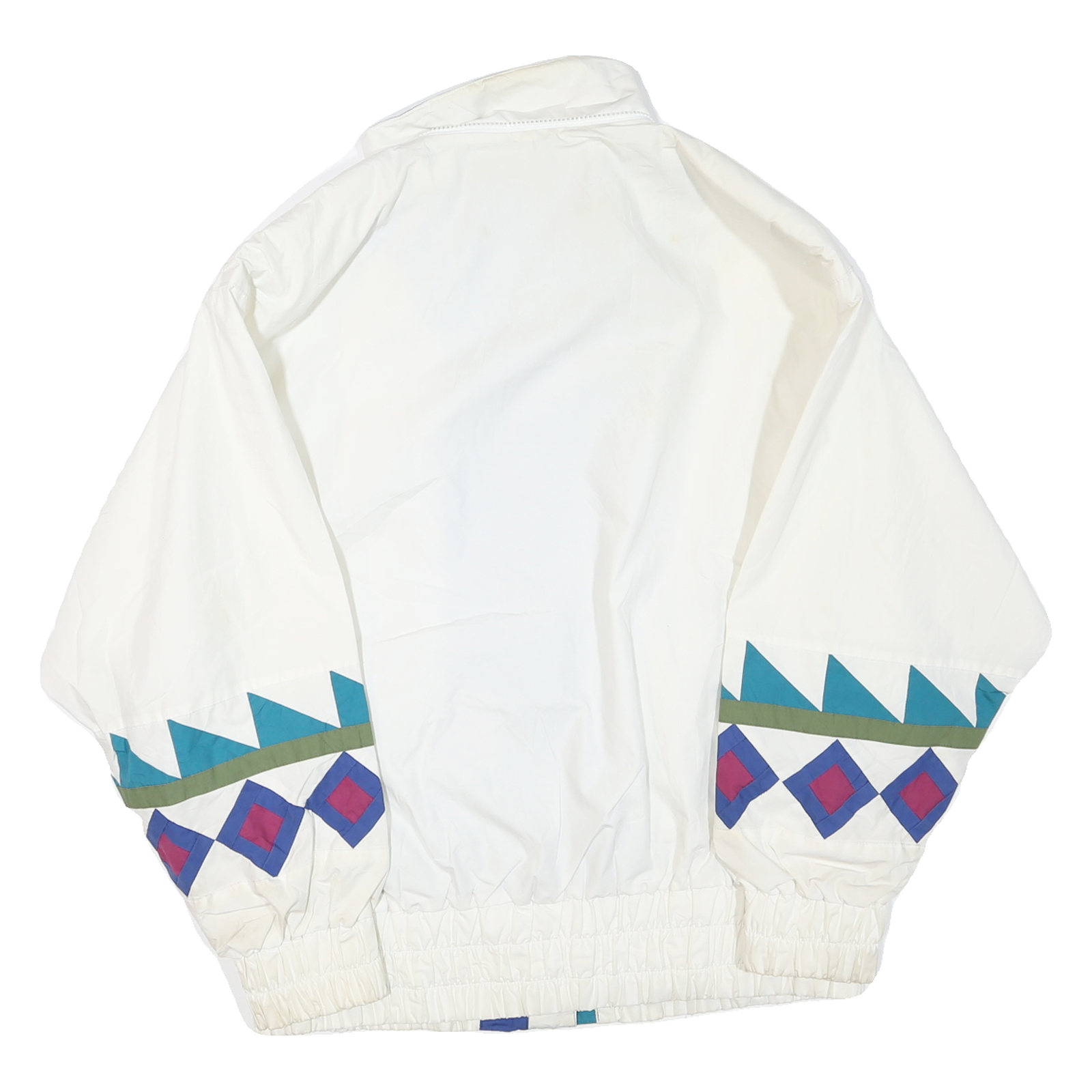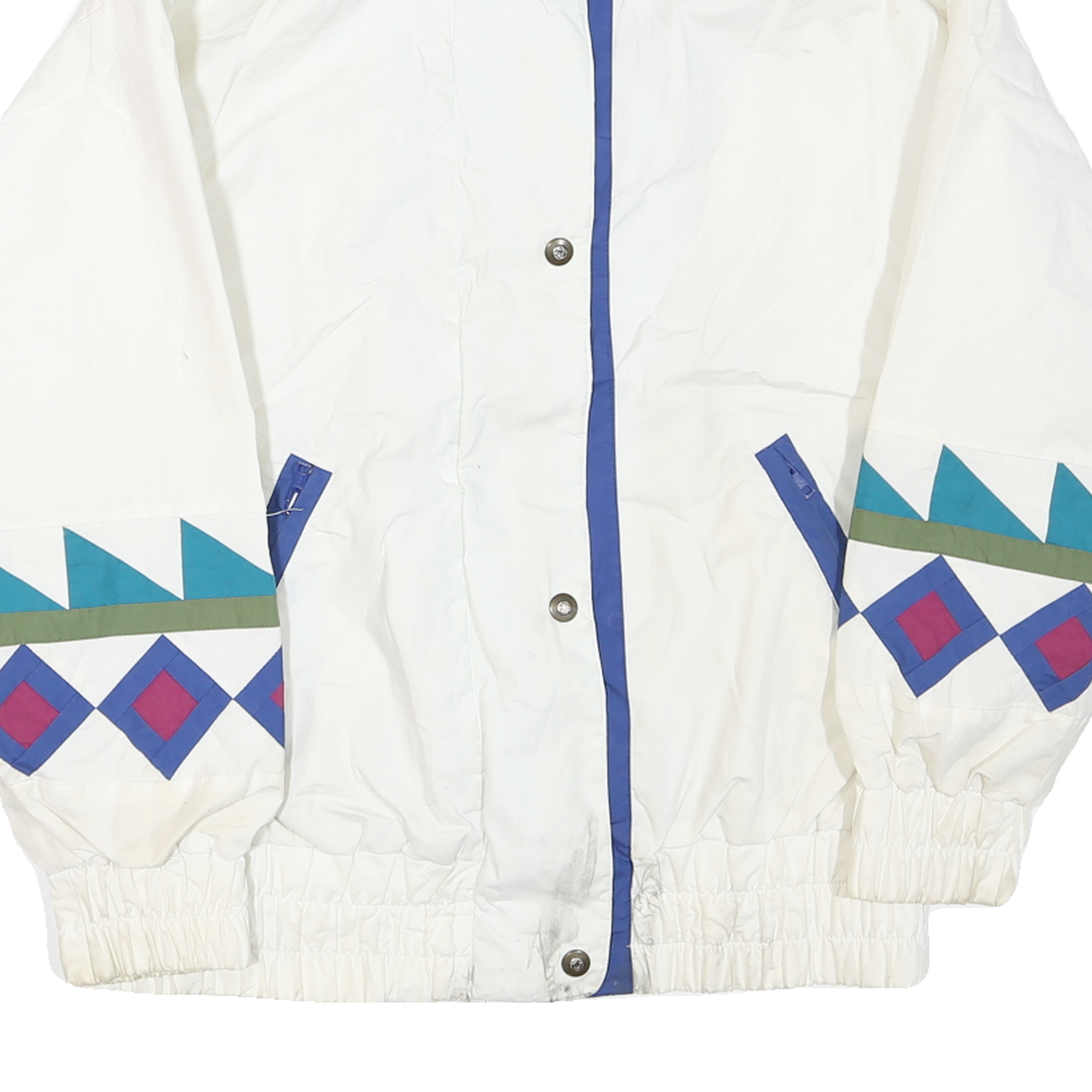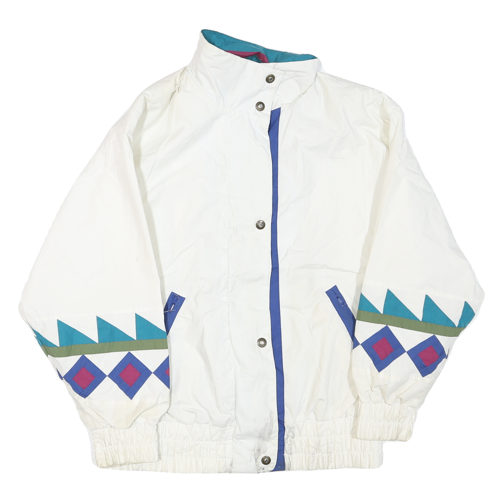 This womens jacket features a crisp white base colour with bold geometric patterns in blue, turquoise, purple, and olive green adorning the sleeves. The jacket has a high stand-up collar and is fully zip fastened with additional snap buttons for secure closure. The elasticated hem and cuffs offer a relaxed, comfortable fit.