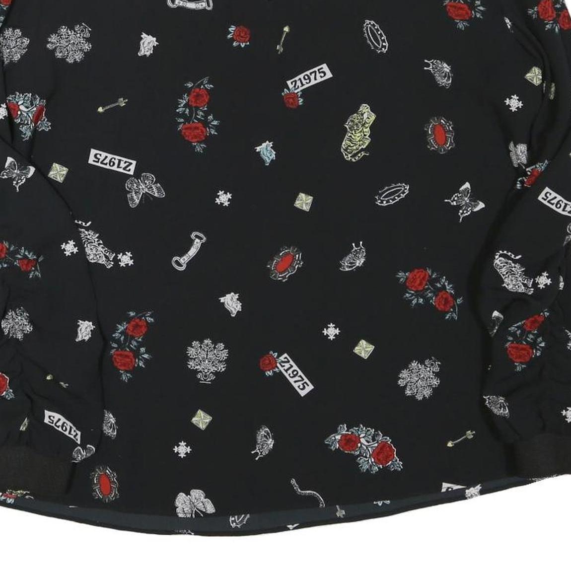 This ZARA womens top features a black base decorated with a distinctive all-over print comprising red roses, various symbols, and subtle text elements including 'Z1975'. The design is eye-catching yet elegant, with a round neckline and long sleeves finished with elasticated black cuffs for a comfortable fit.
