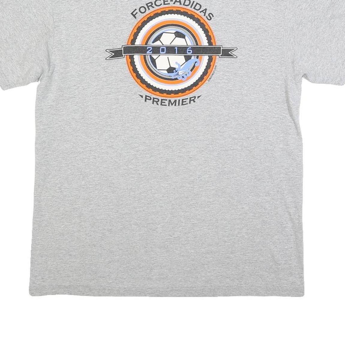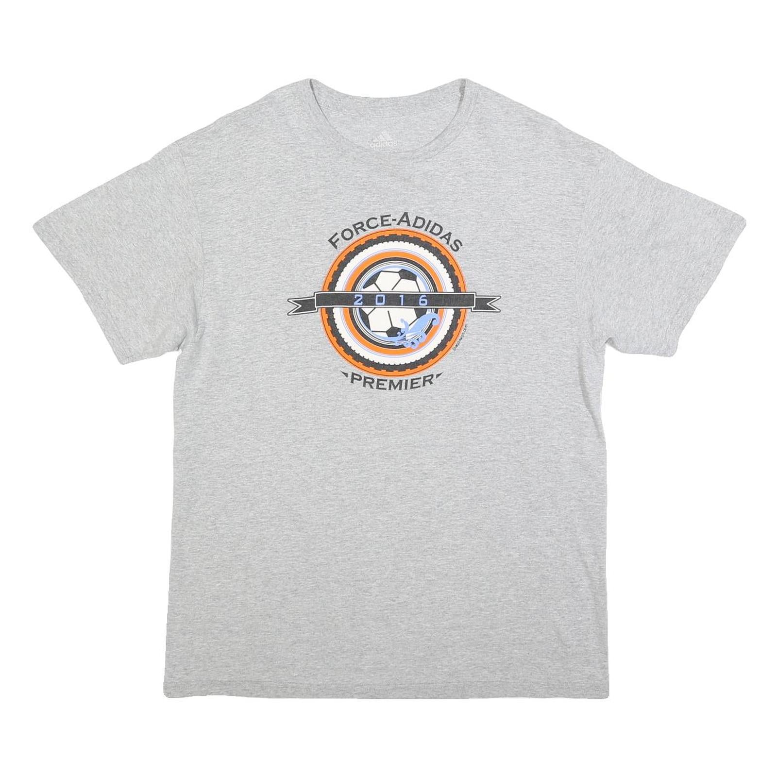 This Adidas Mens T-Shirt features a light grey cotton blend fabric with a central graphic print on the front, displaying a football motif with the text "Force-ADIDAS Premier 2016" in black, orange, and blue detailing. The back carries a large black Adidas logo below the neckline for bold brand recognition.