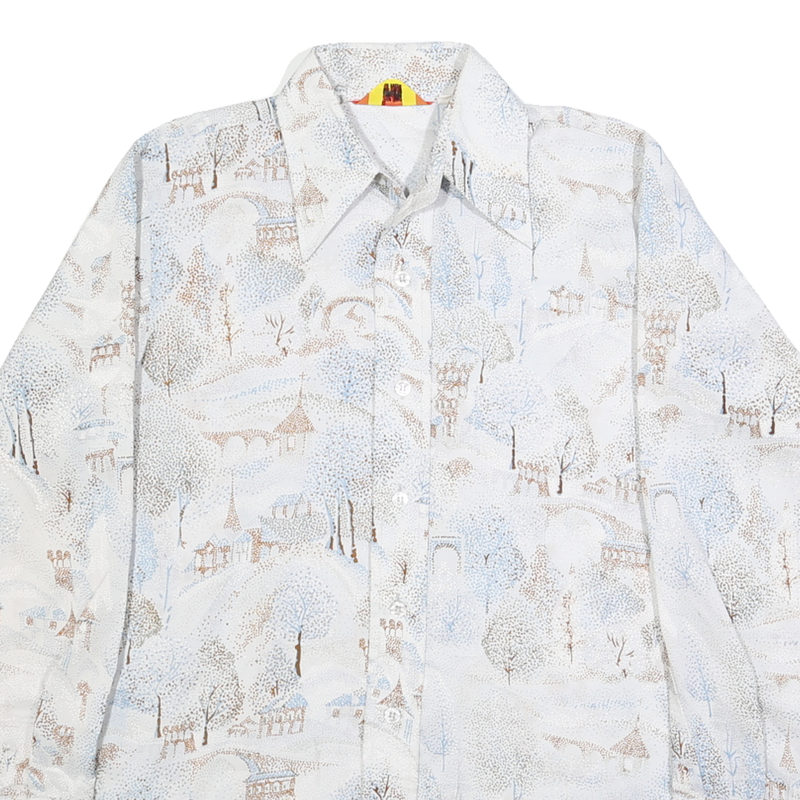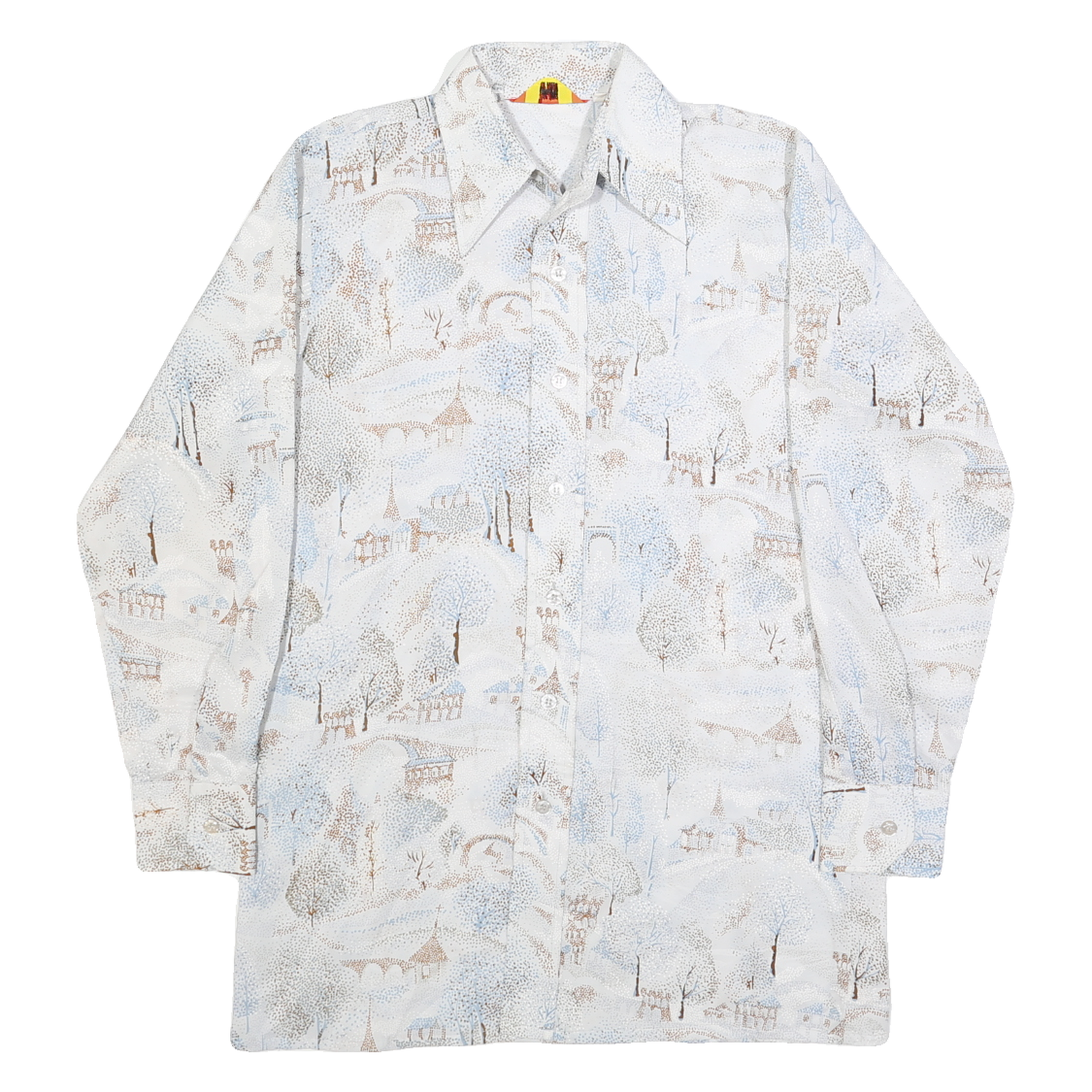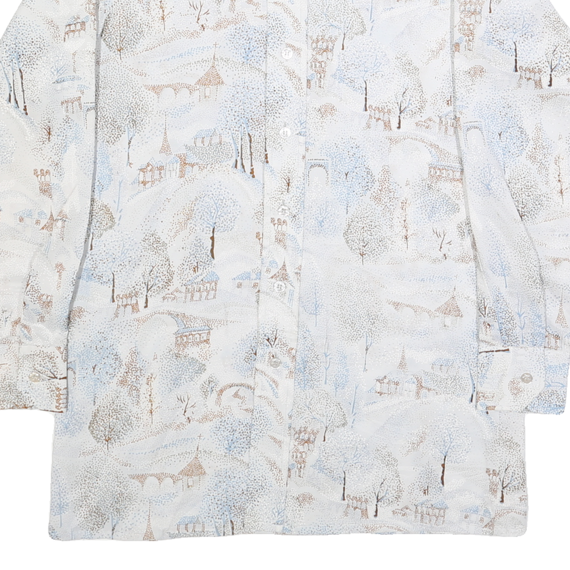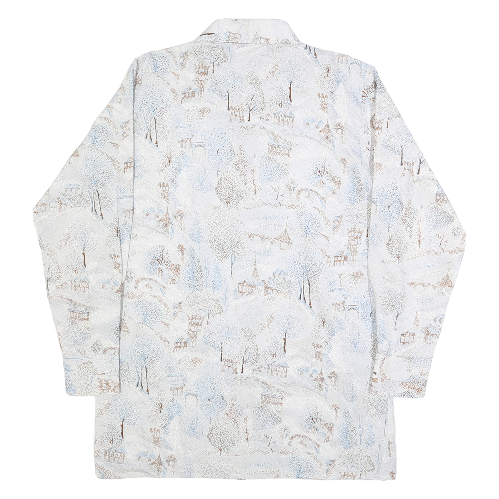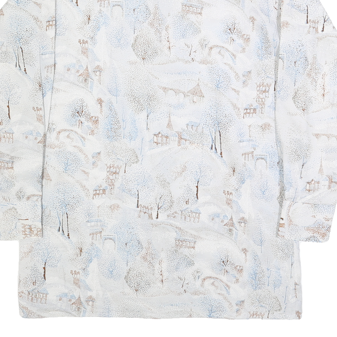 This Baymarket mens shirt features an elegant all-over abstract print in subtle white and light blue tones accented with beige shades, depicting a delicate landscape scene. The button-down shirt is crafted from soft faux silk, offering a smooth, lightweight feel with a slight sheen that adds sophistication. It has a pointed collar and long sleeves with buttoned cuffs, enhancing the classic silhouette.