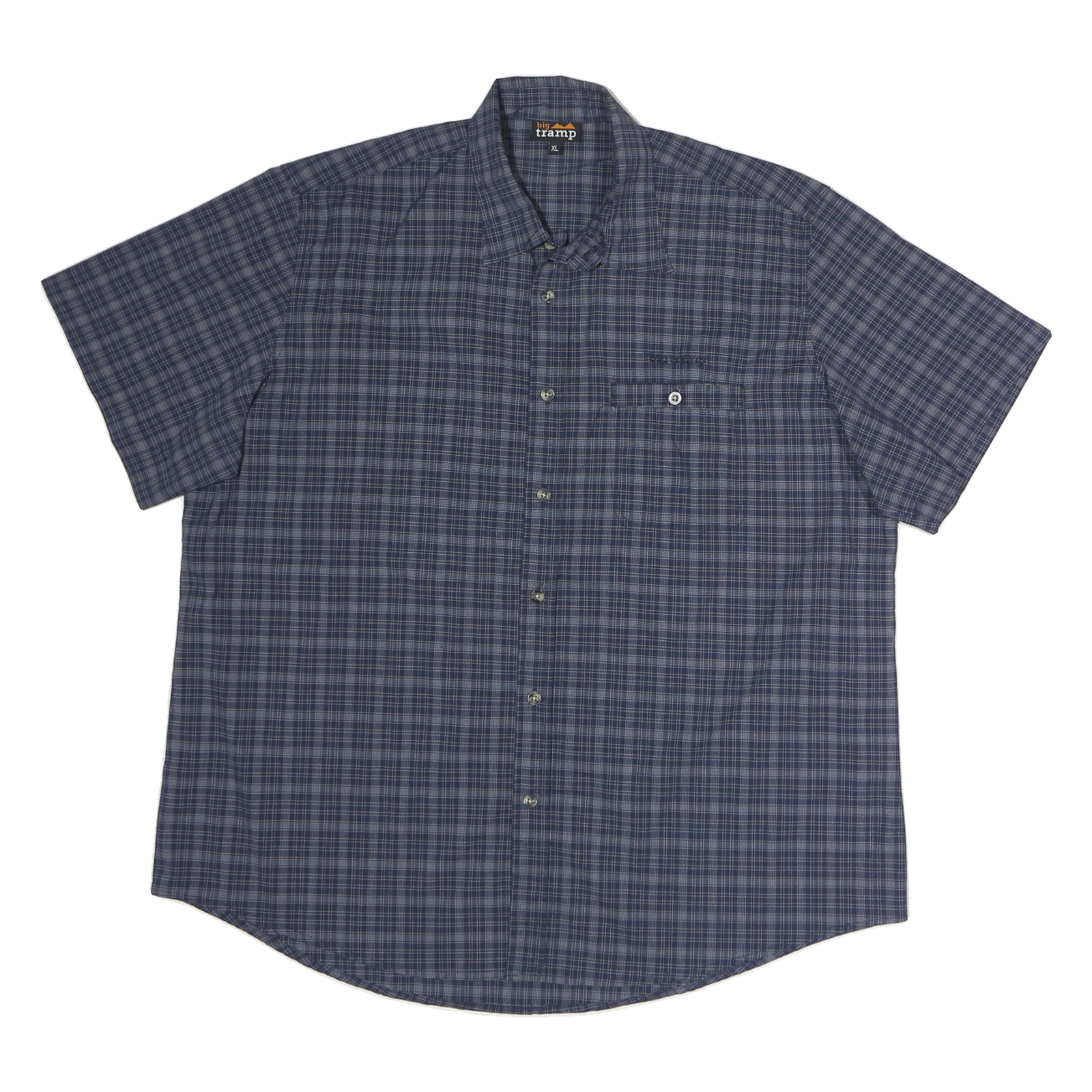 This BIG TRAMP mens shirt features a blue check pattern with a subtle mix of lighter and darker shades creating a classic look. The shirt includes a button-up front and a single chest pocket embroidered with the BIG TRAMP logo. It is designed with a casual short sleeve style and a pointed collar for a laid-back yet neat appearance.