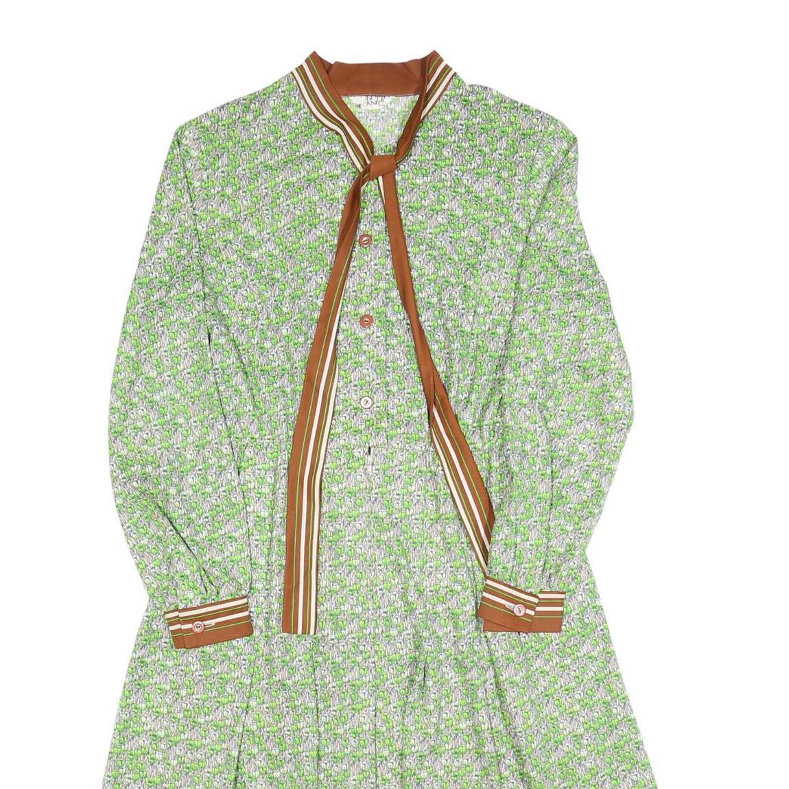 This womens dress by BUTTE KNT showcases a fresh green and brown floral print on a soft polyester blend fabric. The shirt dress style features a button-down front, elongated tie neck detail, and long sleeves with contrast brown striped cuffs that add a unique touch.