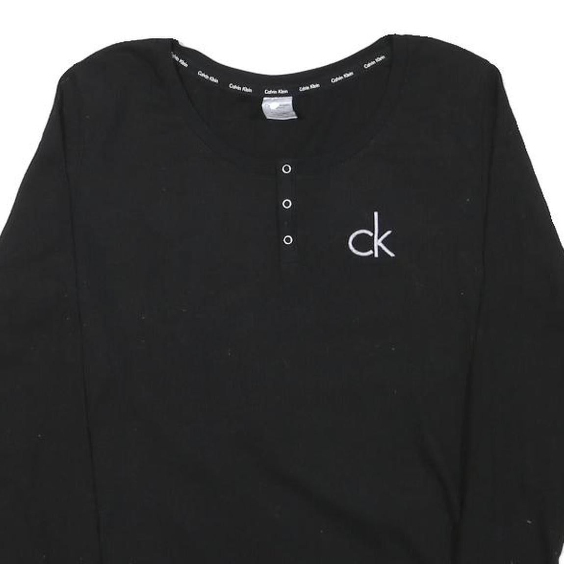This Calvin Klein Jeans womens T-shirt features a sleek black colour with a small, subtle white embroidered 'ck' logo on the left chest. It has a classic crew neckline enhanced by three small decorative buttons at the centre front. The long sleeves and plain design make it an essential layering piece for cooler days.