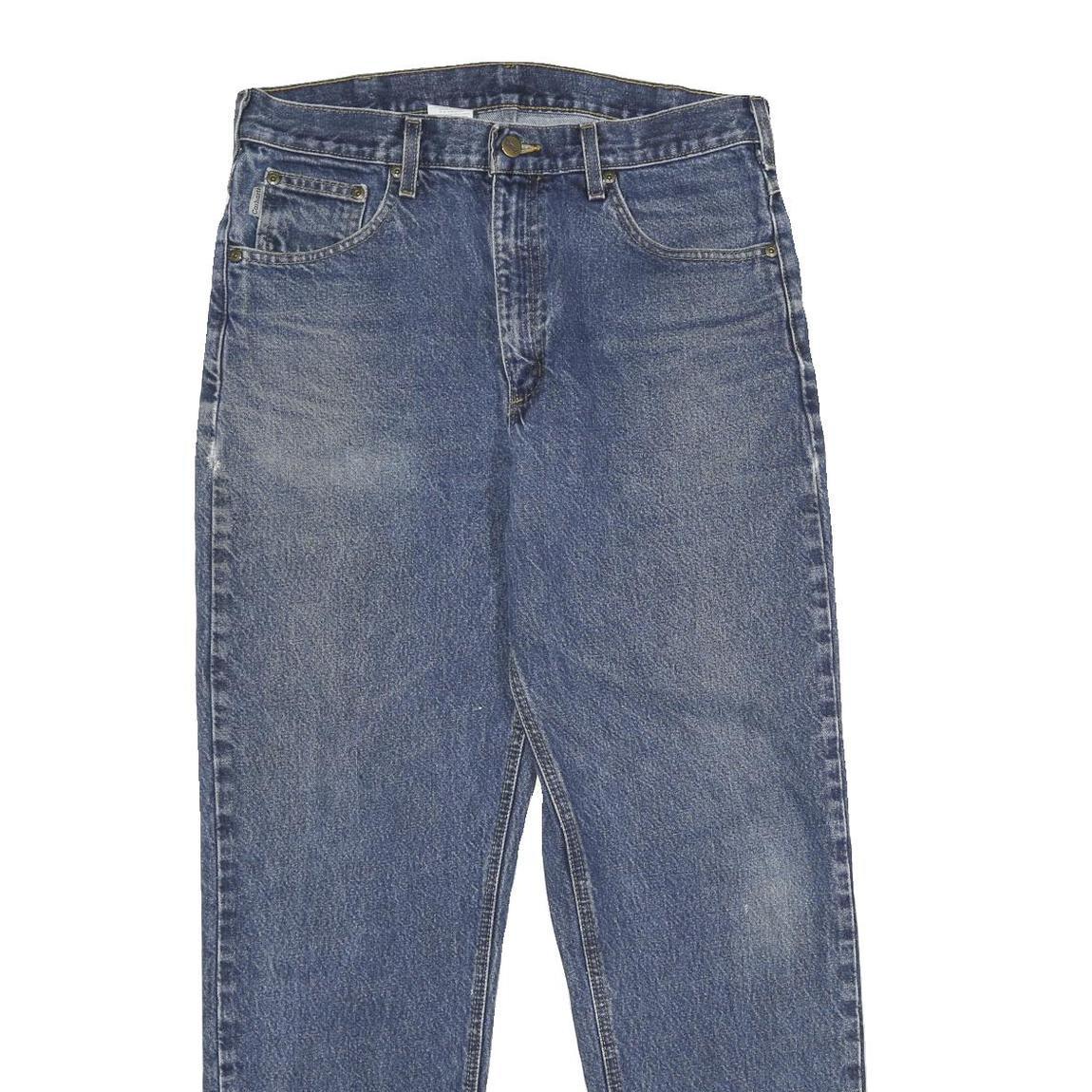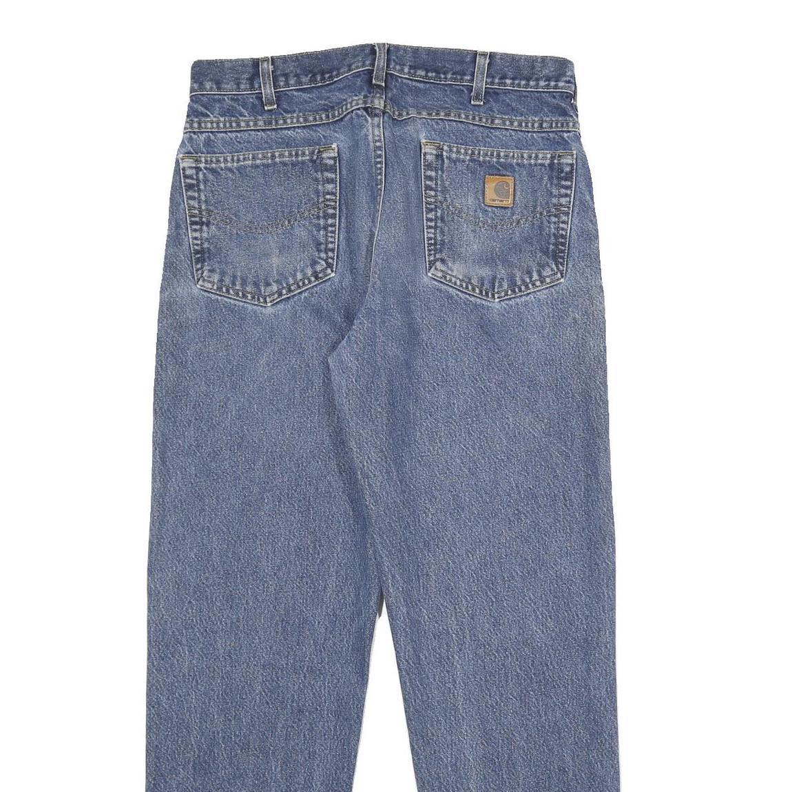 These Carhartt Mens jeans feature a classic straight leg design with a medium blue denim wash. The fabric shows subtle fading and wear that gives a vintage, lived-in look while maintaining structural integrity. The front closure is a practical zip and button, complemented by traditional five-pocket styling.