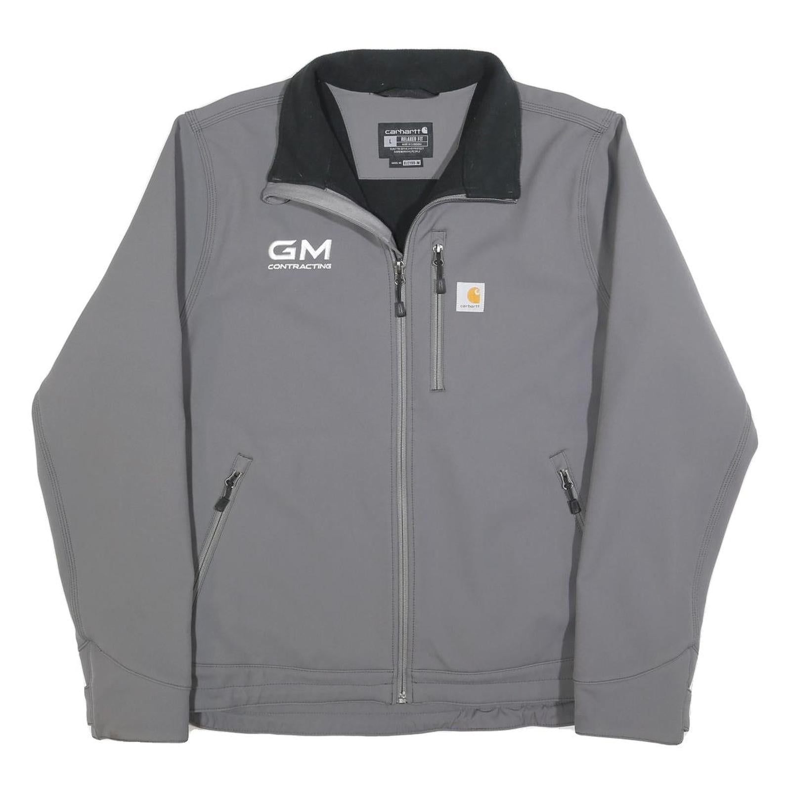 This Carhartt mens jacket features a solid grey colour with a black stand-up collar and the embroidered white logos "GM CONTRACTING" and the Carhartt badge on the chest. It has a clean, workwear aesthetic ideal for durability and functionality.