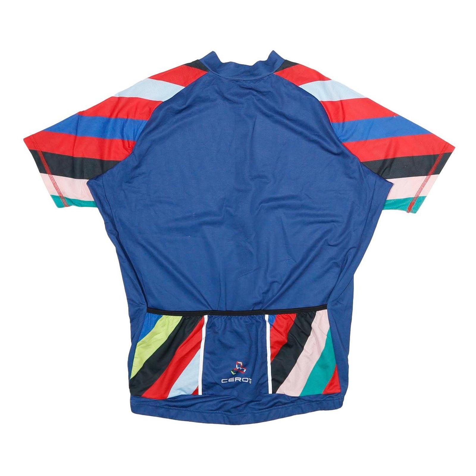 This CEROTI men's cycling t-shirt features a bold navy blue front and back complemented by striking red, light blue, black, and green graphic patterned sleeves and rear pockets. The front chest area displays the CEROTI logo embroidered in white and red, adding brand distinction. A full-length front zip and crew neck design complete the sporty look.