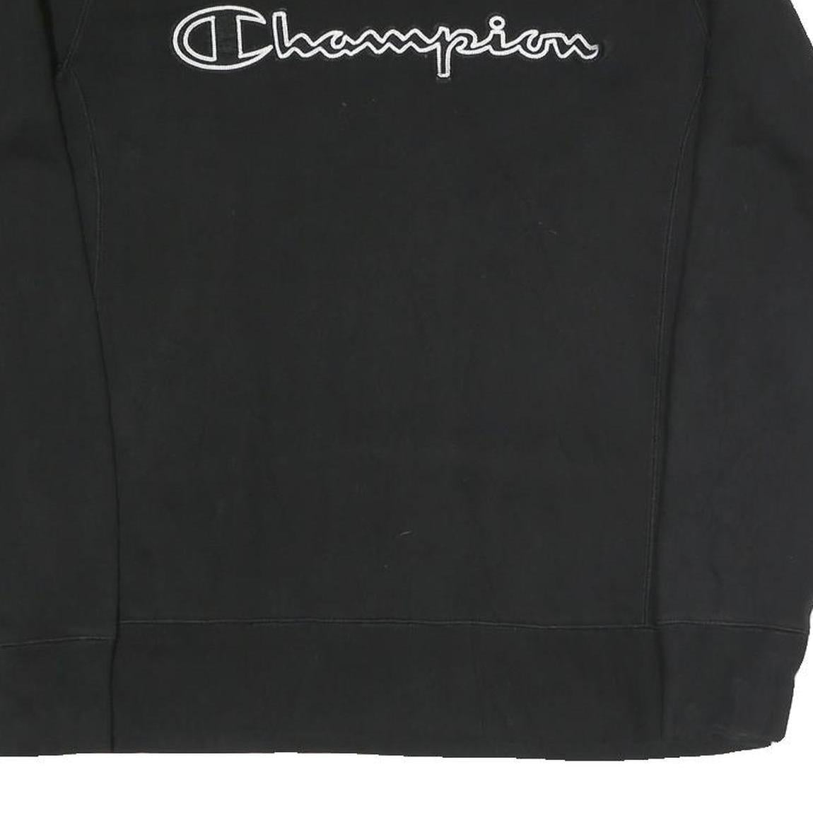 This Champion sweatshirt features a classic black colour with the brand name embroidered prominently across the chest in white and black outlined stitching. The fabric is a soft cotton blend providing a comfortable and breathable feel suitable for everyday casual wear. It has a traditional crew neck design with raglan long sleeves adding ease of movement.