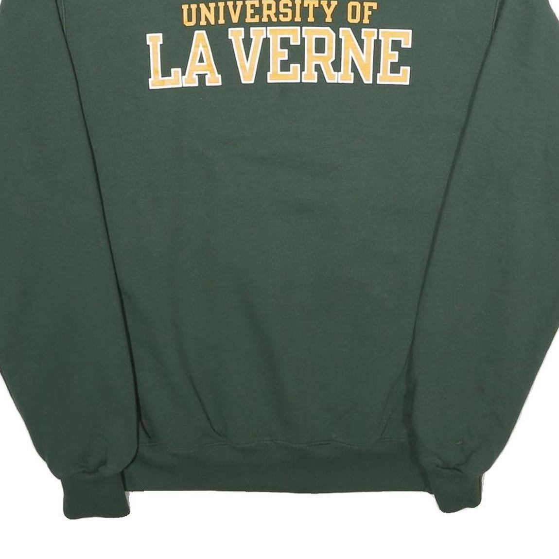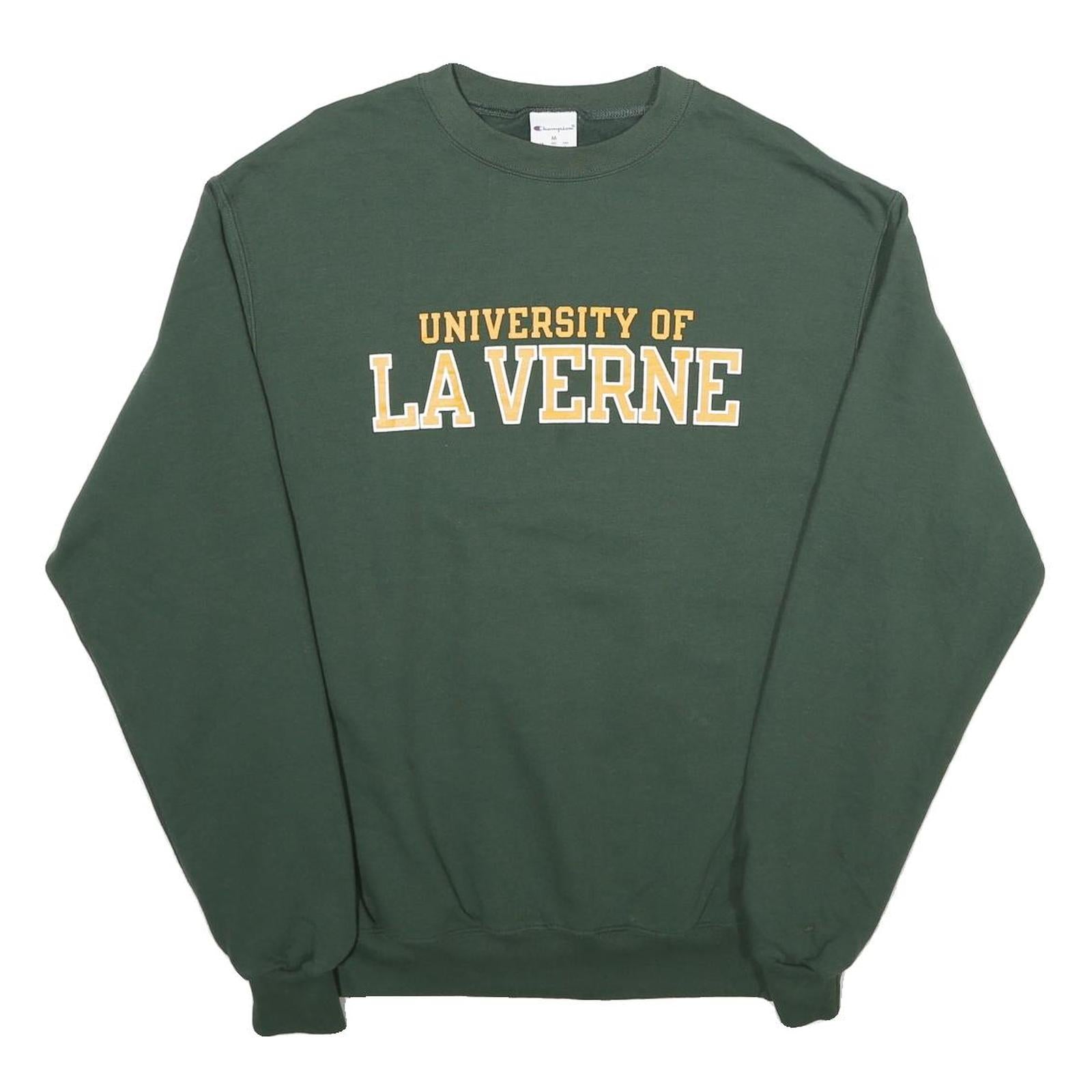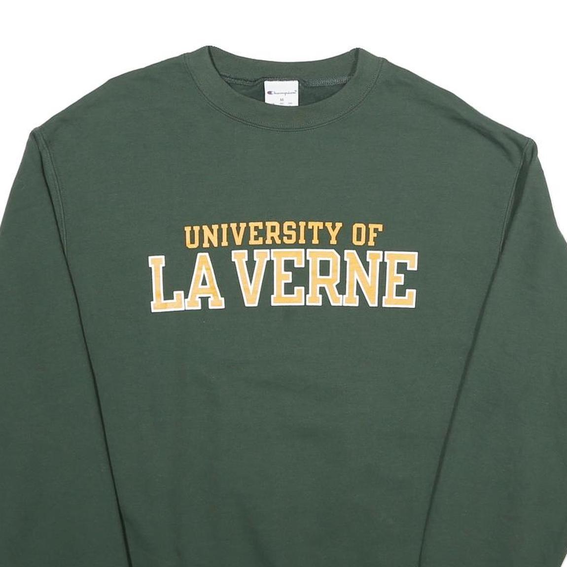 This Champion sweatshirt features a solid green colour with a bold "University of La Verne" print across the chest in white and yellow lettering. It has a classic crew neck design and long sleeves with ribbed cuffs and hem for a secure and comfortable fit.