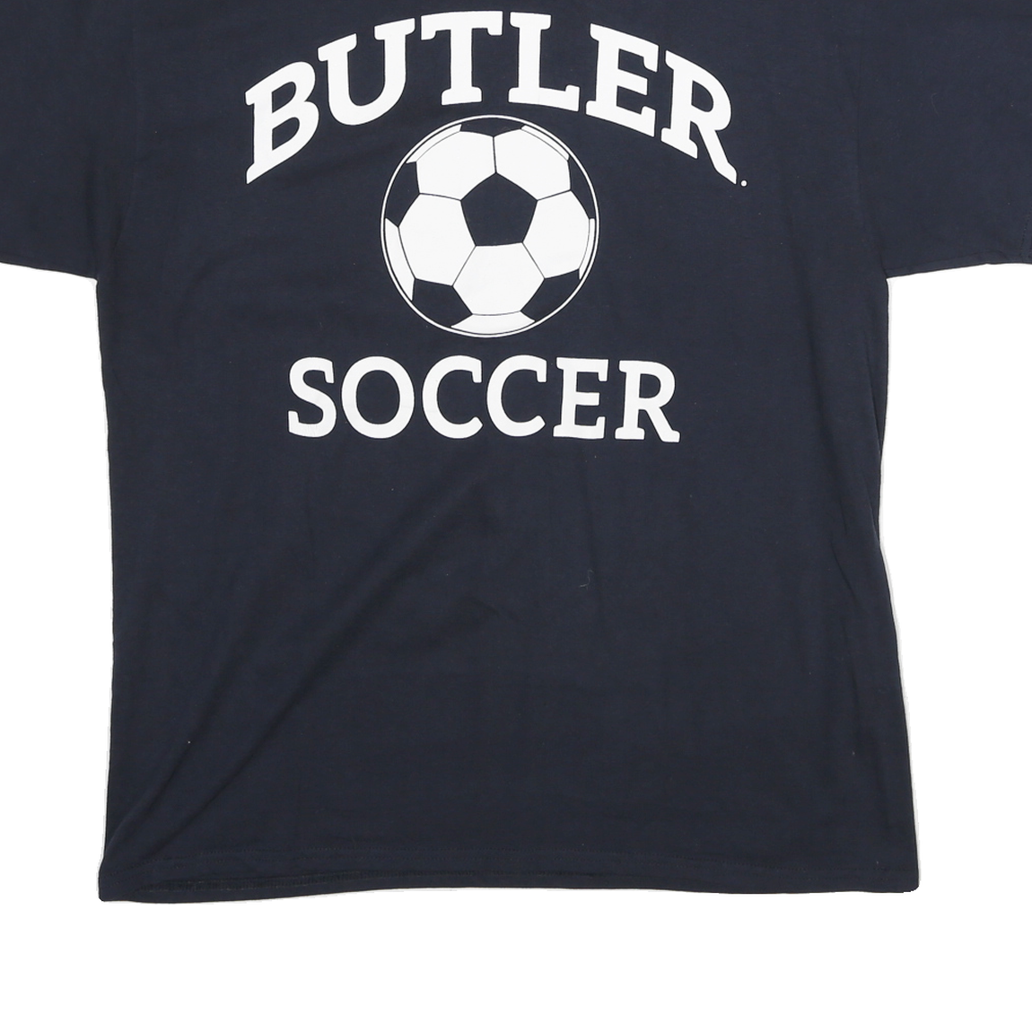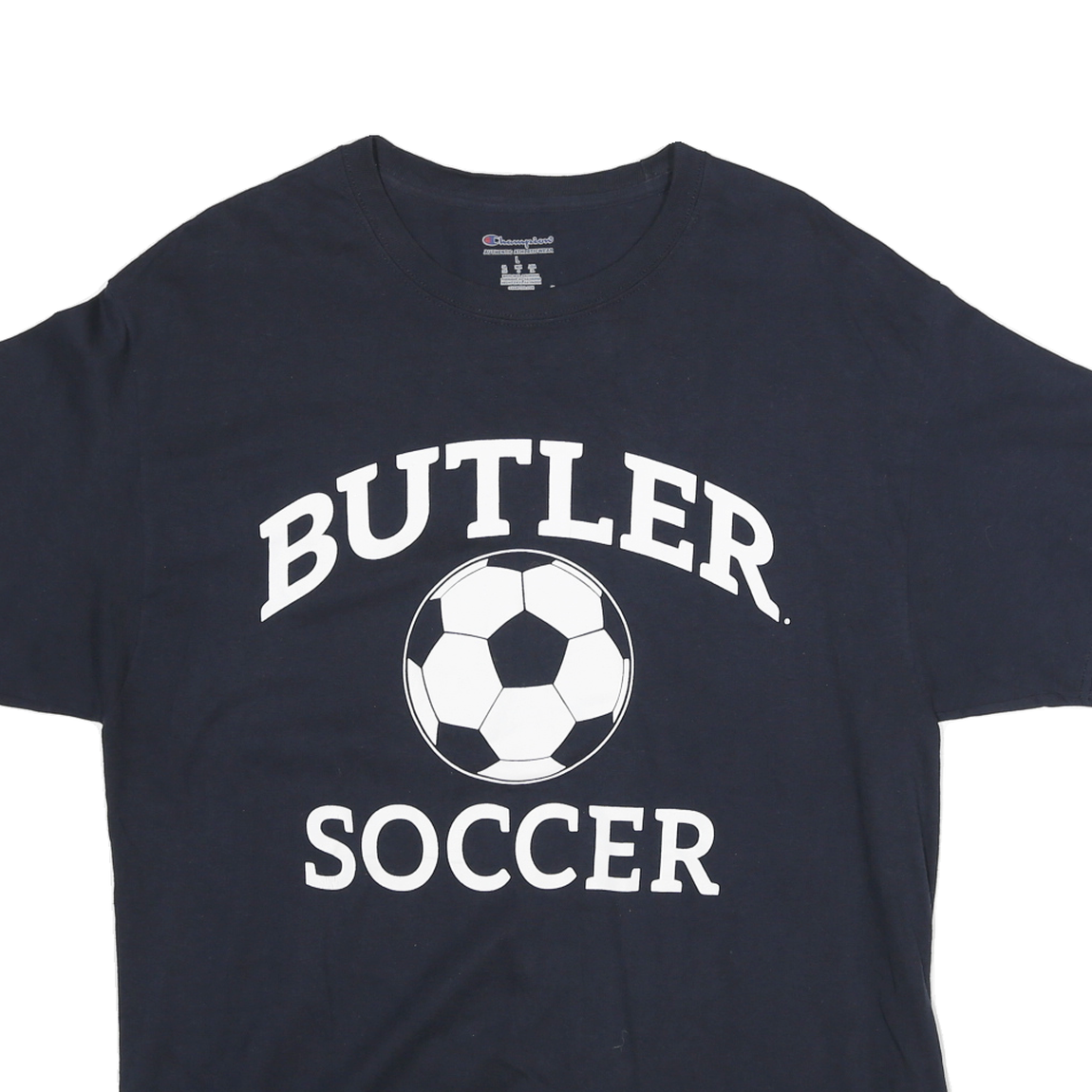 This Champion Mens T-shirt features a classic navy blue colour with a bold white graphic at the front, displaying the words "BUTLER SOCCER" along with a football illustration. The print is centred and clear, making it perfect for casual sporty style.