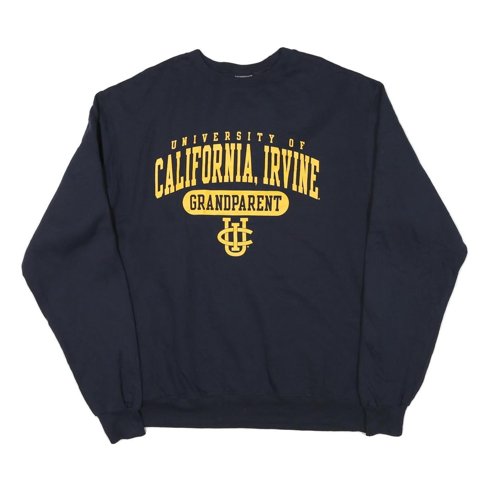 This men's sweatshirt from Champion features a navy blue base with bright yellow printed text on the front reading "University of California, Irvine Grandparent" along with a distinctive UCI logo beneath. The rear is plain navy with a small Champion logo embroidered near the left cuff. The crew neck design offers a classic neckline style with long sleeves and ribbed cuffs and waistband for a secure, comfortable fit.