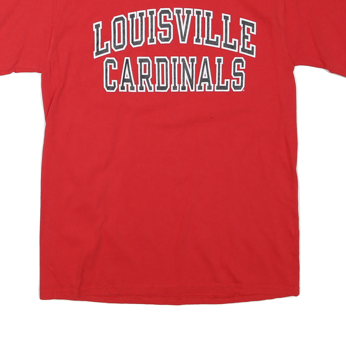 This Champion mens T-shirt presents a vibrant red colour with bold white and black outlined text reading 'Louisville Cardinals' across the front. The design is clean and sporty, featuring a small Champion logo badge on the left sleeve for authentic brand detail.
