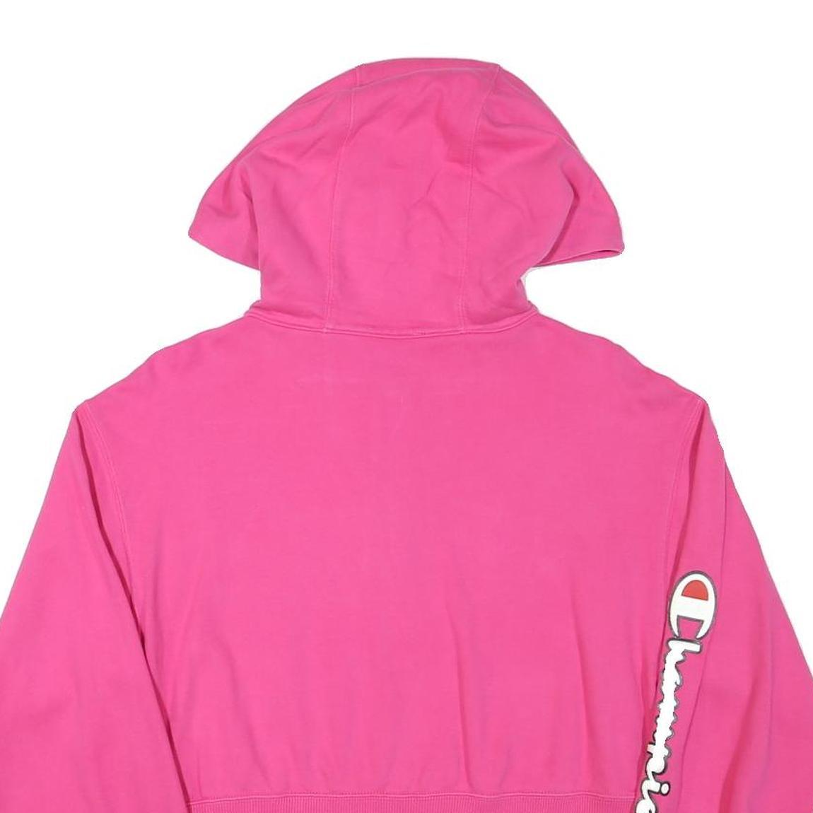 This Womens pullover hoodie by Champion features a vibrant pink colour and a cropped cut. It has a ¼ zip closure with a ring pull at the neckline and a hood for added casual style. The front sports the Champion logo embroidered on the chest, while the sleeve showcases a large Champion script with the brand's iconic C emblem, as well as a small logo at the cuff.