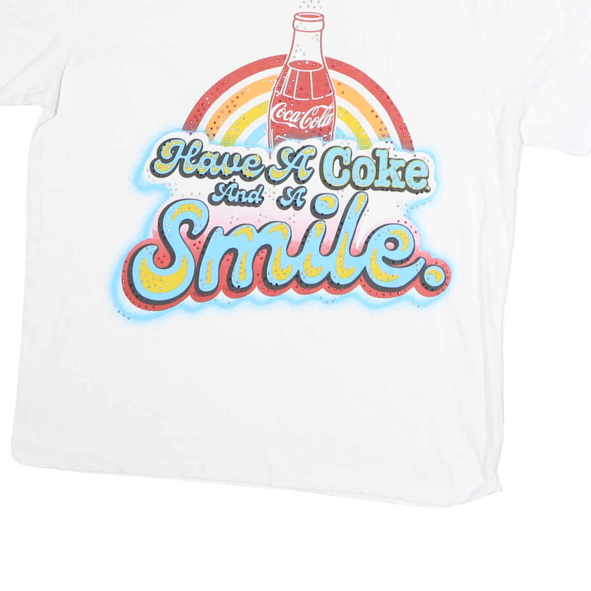 This women's Coca Cola T-shirt features a bright white base with a prominently printed graphic on the front. The design showcases a classic Coca Cola bottle with bubbly details and a multi-coloured rainbow arc behind it. Below the bottle, the encouraging phrase "Have A Coke And A Smile" is vividly accented with blue and yellow highlights, adding a cheerful touch. The back of the shirt is plain white, keeping the focus on the vibrant front graphic.