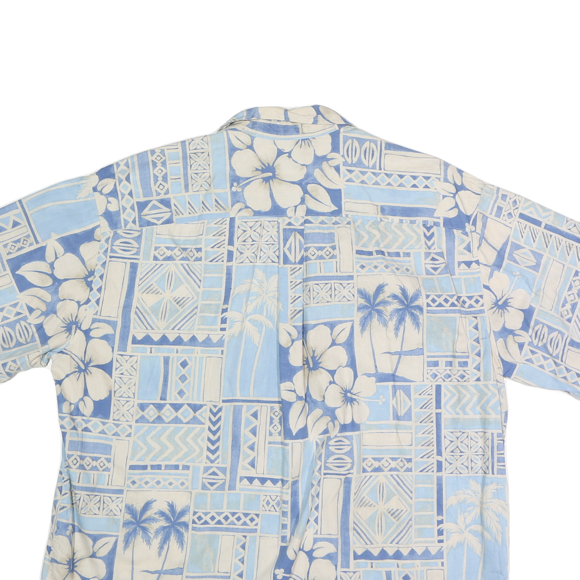 This Cooke Street mens shirt features a light blue base decorated with a traditional Hawaiian print including large hibiscus flowers and palm trees in soft white and beige tones. The shirt displays a relaxed and breezy tropical style perfect for casual warm-weather wear.