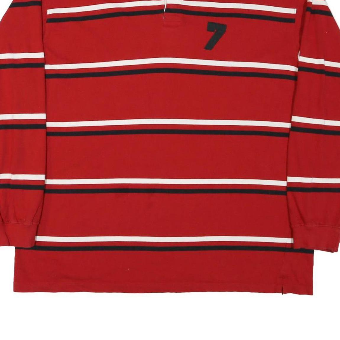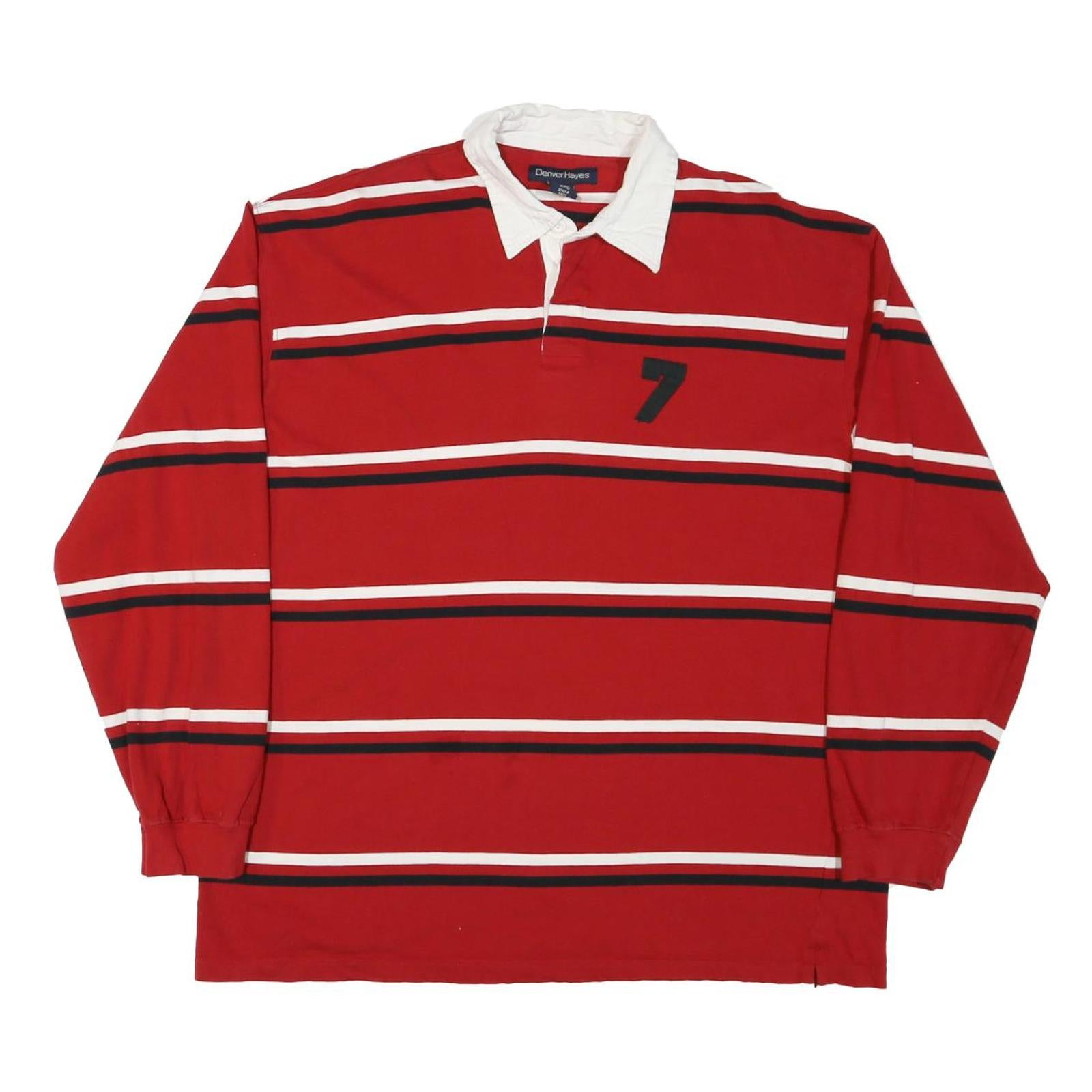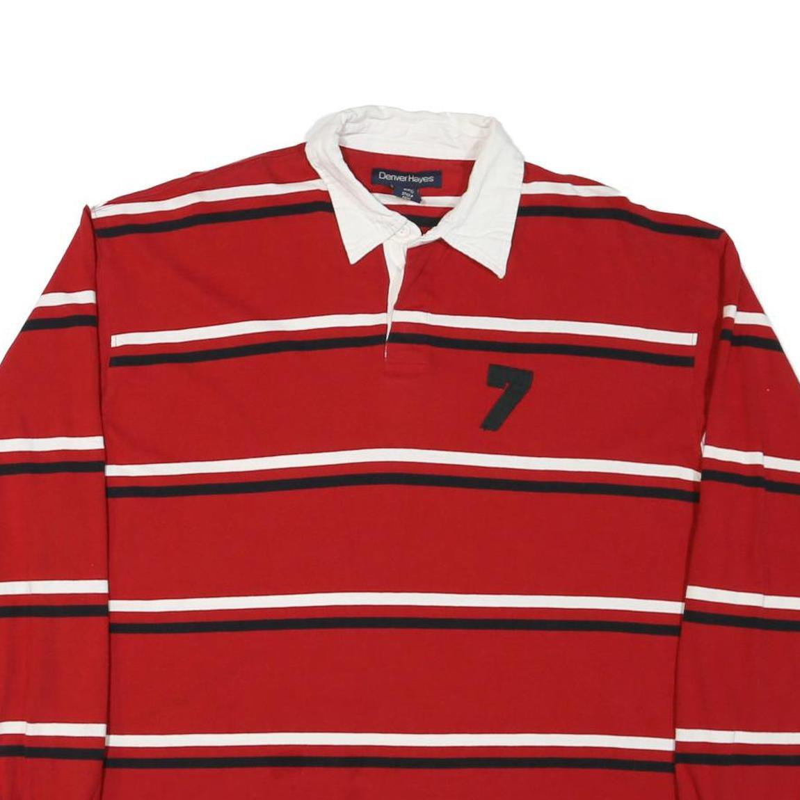 This Denver Hayes mens polo shirt features bold horizontal stripes in red, white, and black across the front and back. A prominent black number 7 is embroidered on the chest, adding a sporty touch. It has a contrasting white collar with a classic button placket.