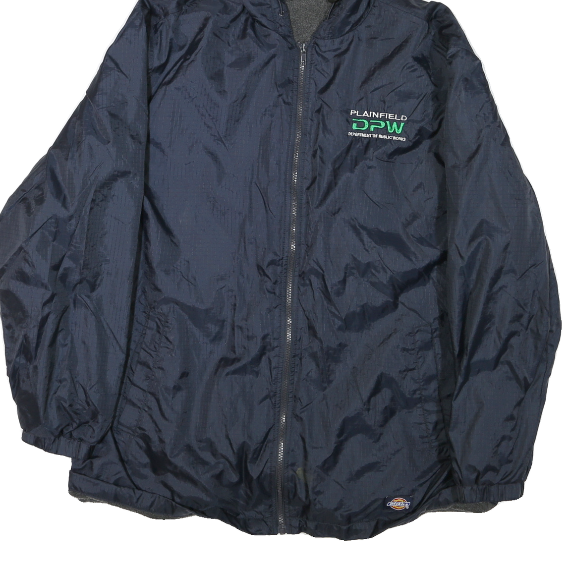This Mens DICKIES jacket is in a deep navy colour with 'Plainfield Department Of Public Works' embroidered in white and green on the chest. It features a hood with adjustable drawstrings and a full zip closure down the front. The jacket has elasticated cuffs and a neoprene-like inner lining visible at the hem and hood interior.