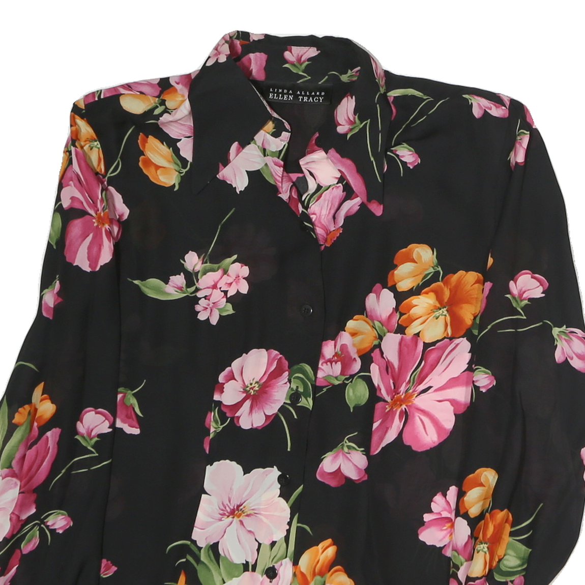 This women's shirt by ELLEN TRACY features a striking black base adorned with a rich floral print in pink, orange, and green tones, creating a vibrant and elegant aesthetic. The blouse showcases a classic pointed collar and long sleeves with cuffed button closures, enhancing its polished appearance.