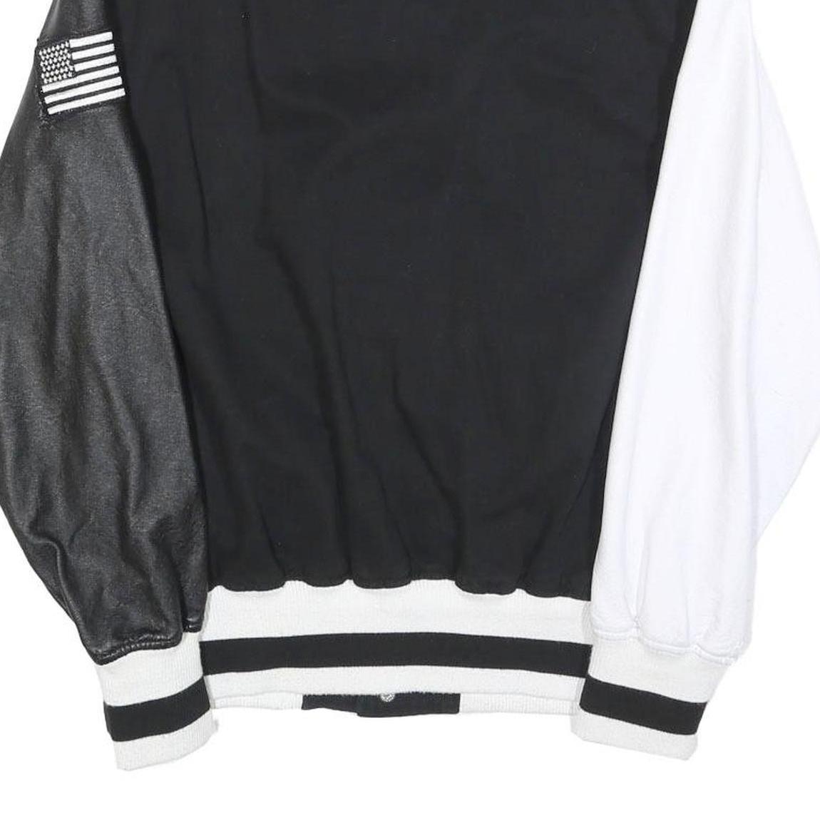 Made from a cotton blend, this jacket provides a comfortable and slightly durable feel, typical of letterman jackets ideal for casual wear. It buttons up the front with white snap buttons and has a ribbed collar, cuffs, and hem with black and white stripes, offering a snug fit that is traditional for this style. Designed for boys, this size Large item offers a relaxed fit with long sleeves and a standard length.