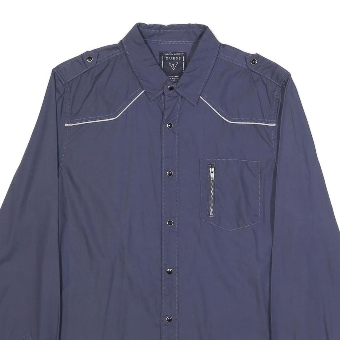 This men's Guess shirt is crafted from soft blue cotton for comfortable wear. It features a classic collar and long sleeves with buttoned cuffs, offering a timeless look suitable for casual or smart casual outfits. The shirt has black snap buttons down the front and a zippered chest pocket adding subtle utility and style.