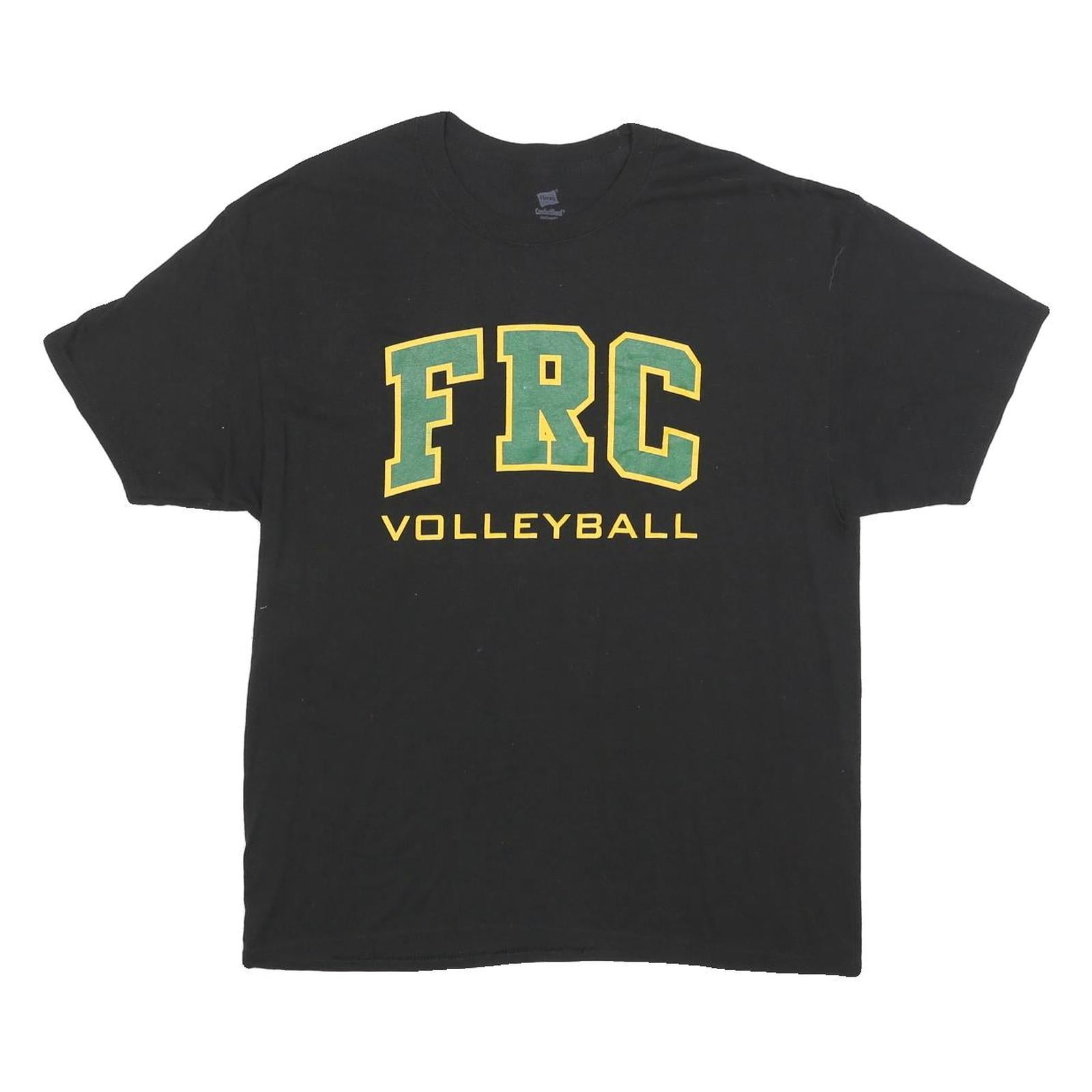 This mens Hanes t-shirt is crafted from a comfortable cotton blend fabric, offering a soft and breathable feel ideal for casual wear. It features a classic black colour with a bold graphic on the front displaying the letters "FRC" in green outlined with yellow, and the word "Volleyball" printed below in yellow block letters.