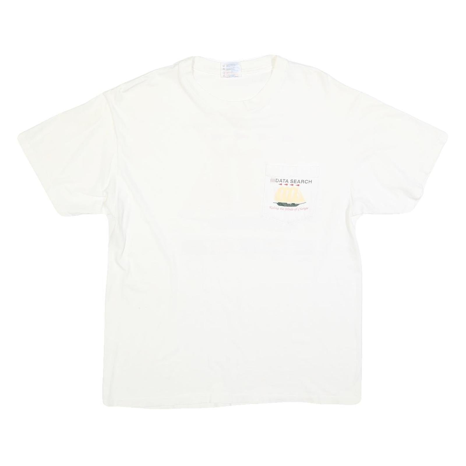 This mens HANES T-shirt is primarily white with a pocket on the front featuring a coloured graphic print of a sailboat and the text "DATA SEARCH." On the back, a larger print showcases a stylised ship with sails and red flags, accompanied by the text "Riding the Winds of Change with the 1996 Southern Financial Conference" and five small flag designs with abbreviations beneath them.