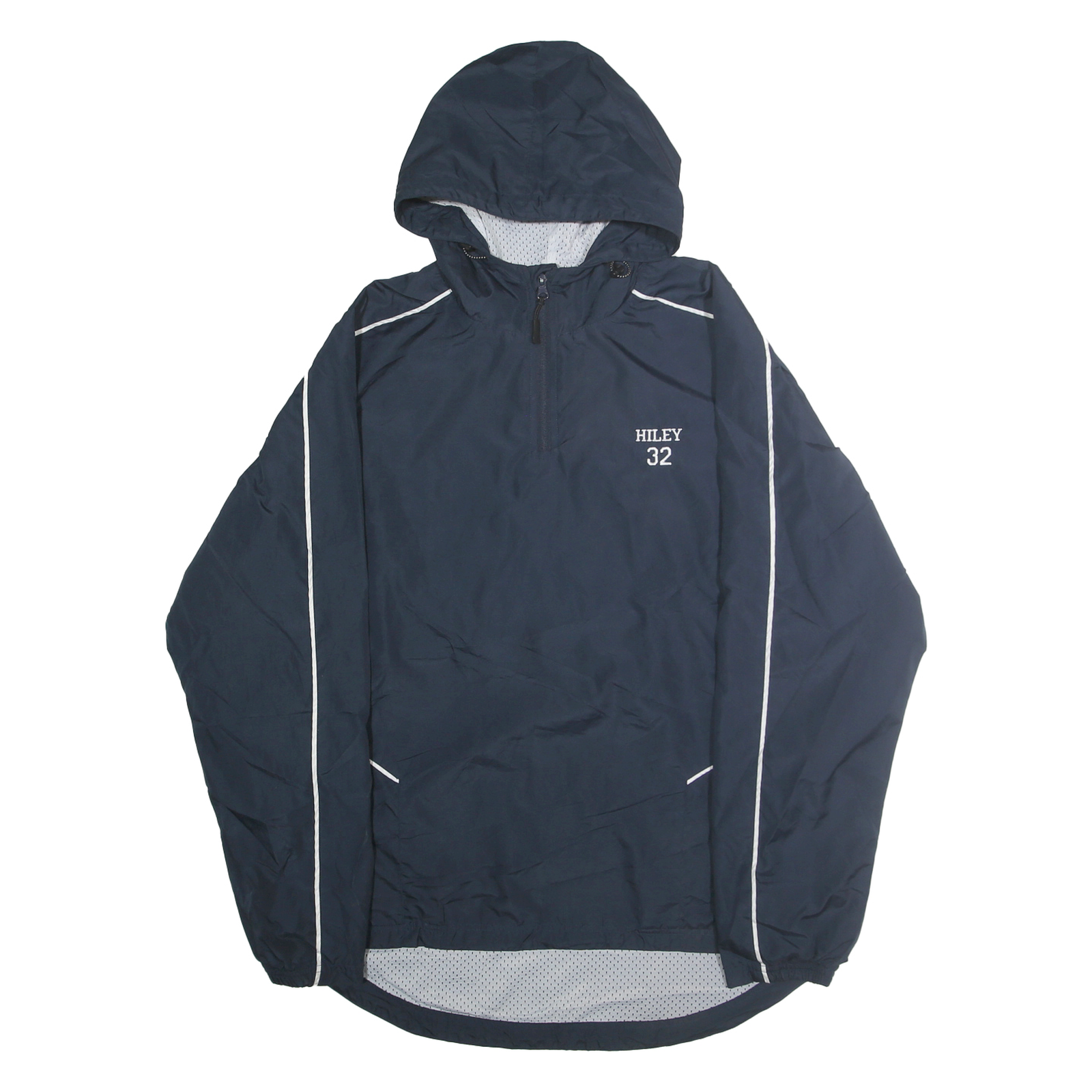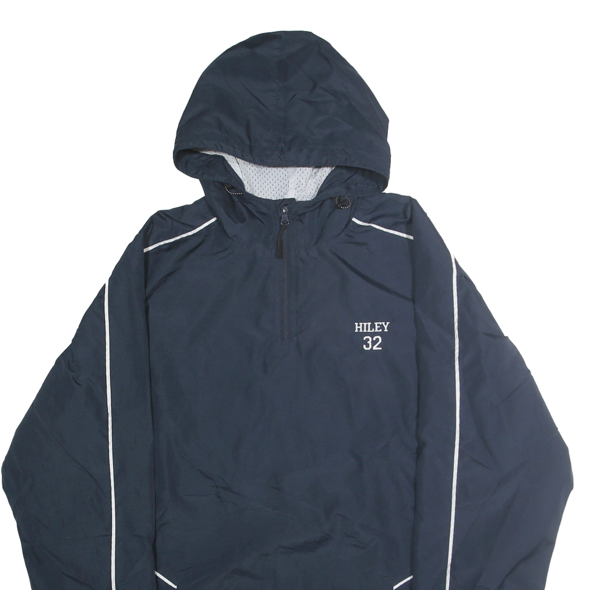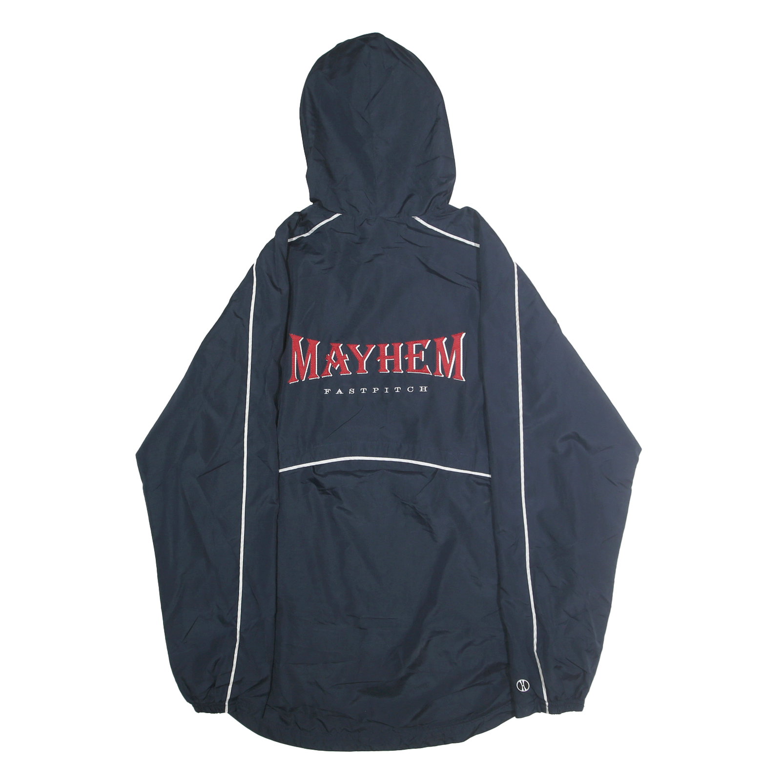 This men's jacket from HOLLOWAY features a deep navy blue colour with white piping along the sleeves and shoulders for a sporty contrast. The front is embroidered with the name "HILEY 32" and the back prominently displays a bold "MAYHEM FASTPITCH" logo in red and white lettering, giving it an athletic edge. The jacket is designed with a hood and elasticated cuffs to keep out the wind and rain.