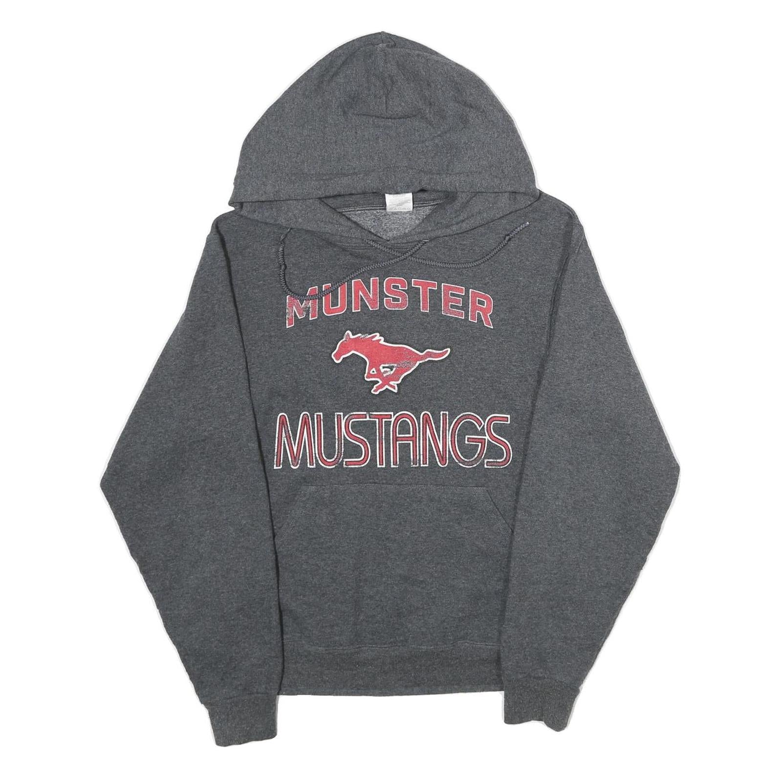 This men's hoodie by Jerzees features a classic pullover style in a solid grey colour. The front showcases bold red and white printed text and a graphic of a mustang, reading "Munster Mustangs". The fabric is a soft cotton blend that offers comfort and warmth, perfect for casual wear.