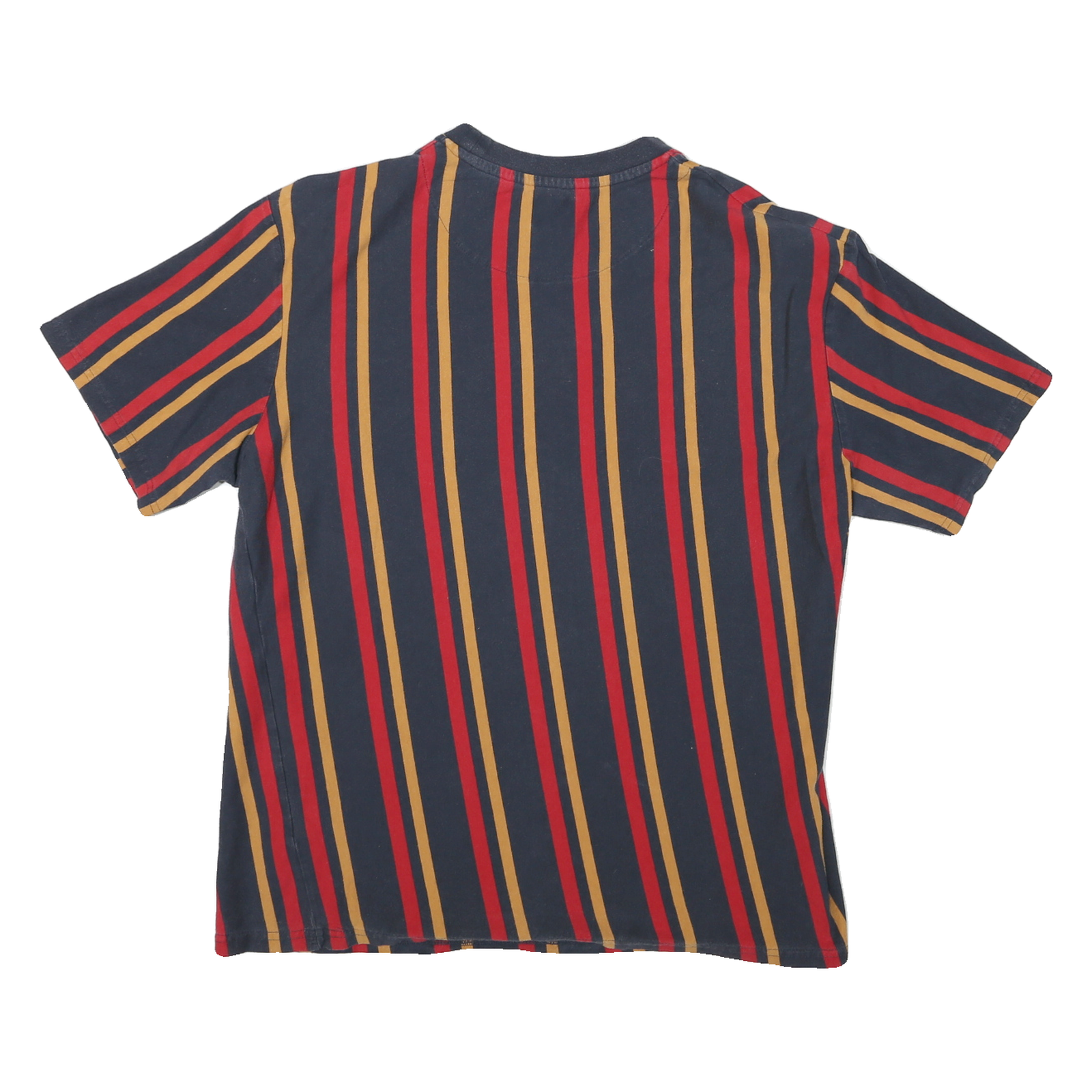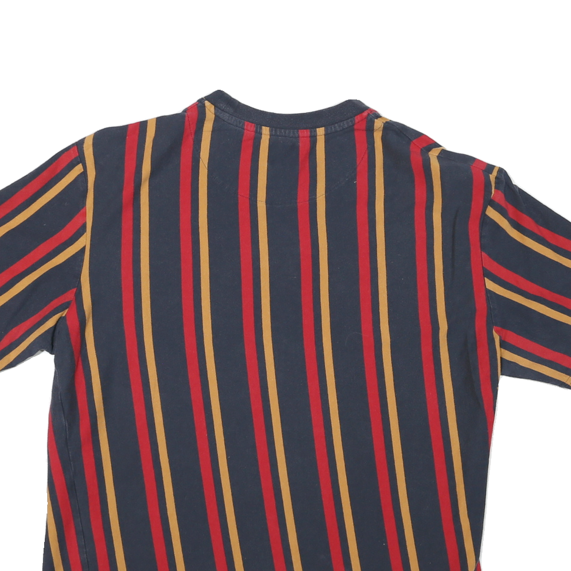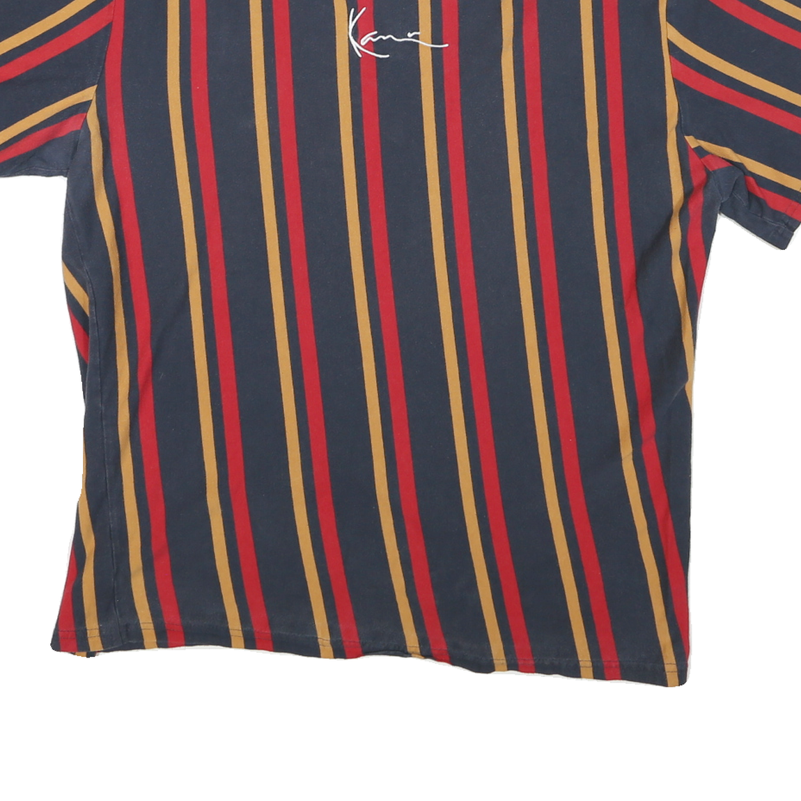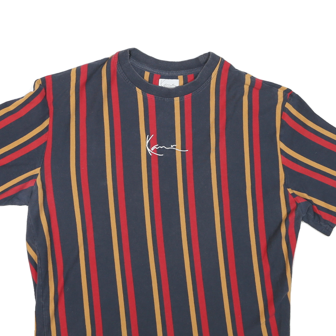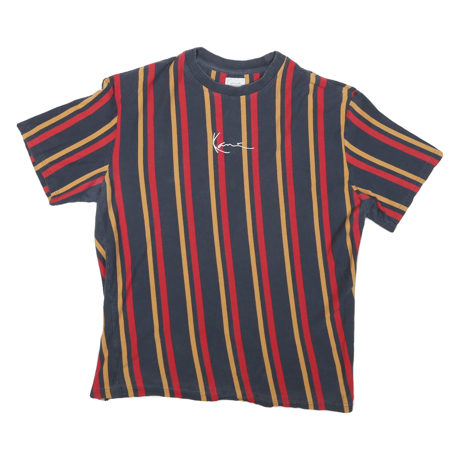 This Karl Kani men's T-shirt features a bold vertical stripe pattern in blue, red, and mustard tones. The front centre displays a subtle white Karl signature logo, blending minimal branding with a stylish colour scheme. The T-shirt has short sleeves and a classic crew neck for a timeless casual look.