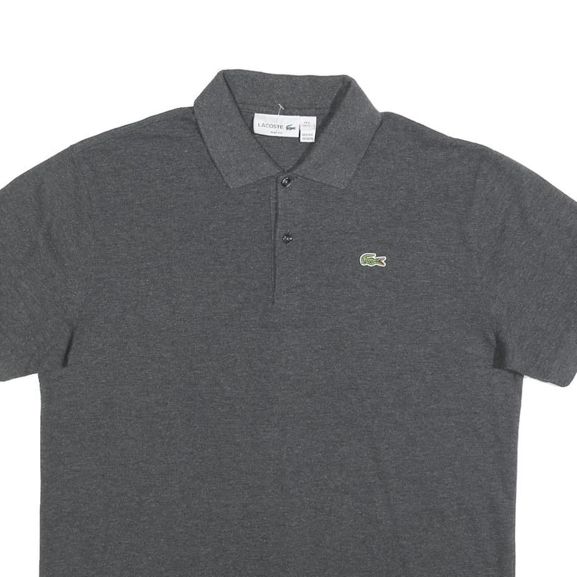 This LACOSTE mens polo shirt features a solid grey colour with the iconic green crocodile logo embroidered on the left chest, representing the brand's signature style. It has a classic polo collar with a two-button placket and short sleeves, offering a timeless look suitable for various casual occasions.