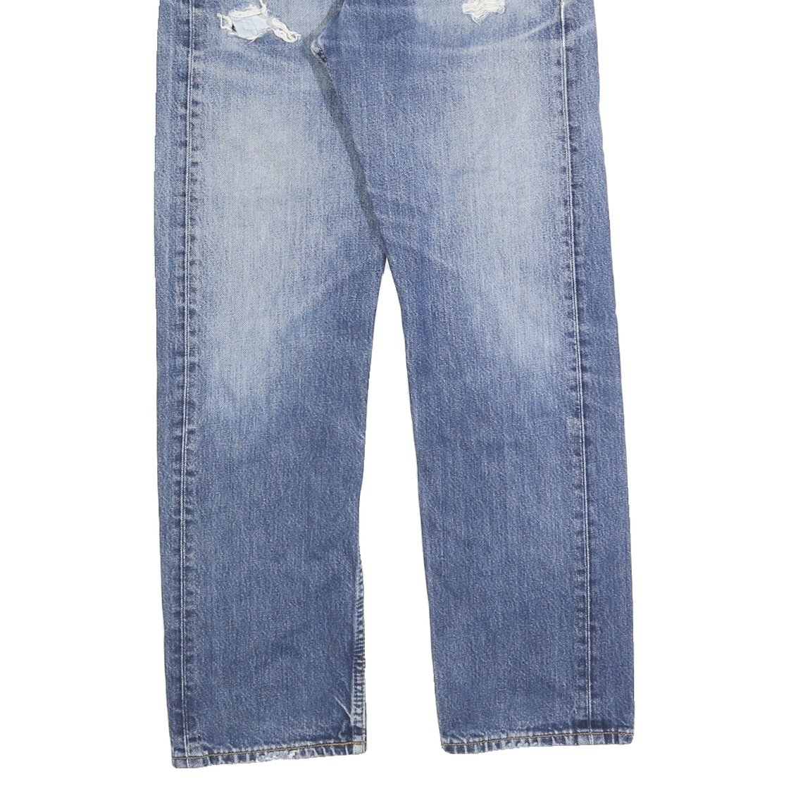 These Levi's mens jeans are crafted from classic blue cotton denim with a regular fit cut. The jeans feature a button closure and traditional five-pocket styling. Distressed details with frayed patches are visible on the front and back, lending a worn-in, vintage character.