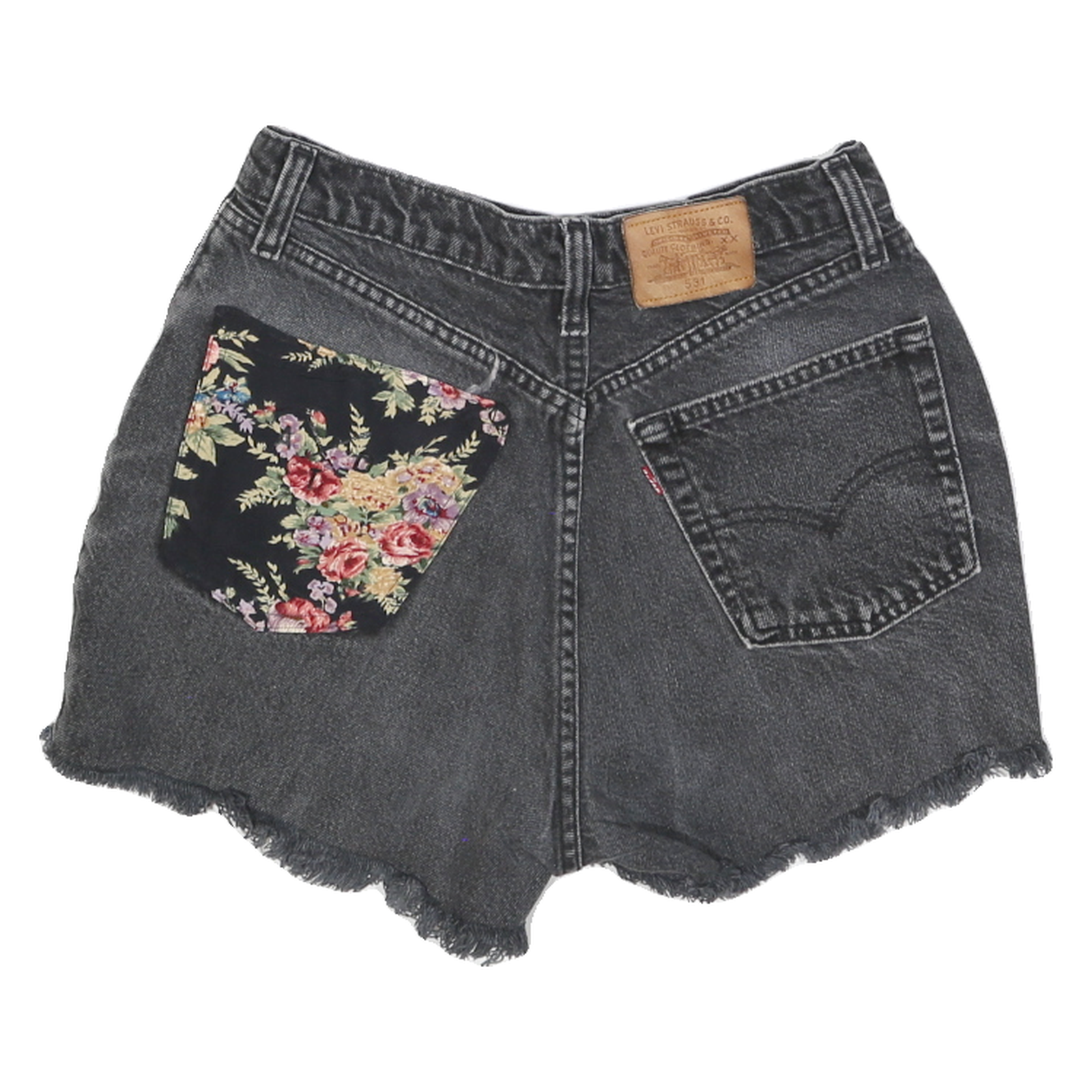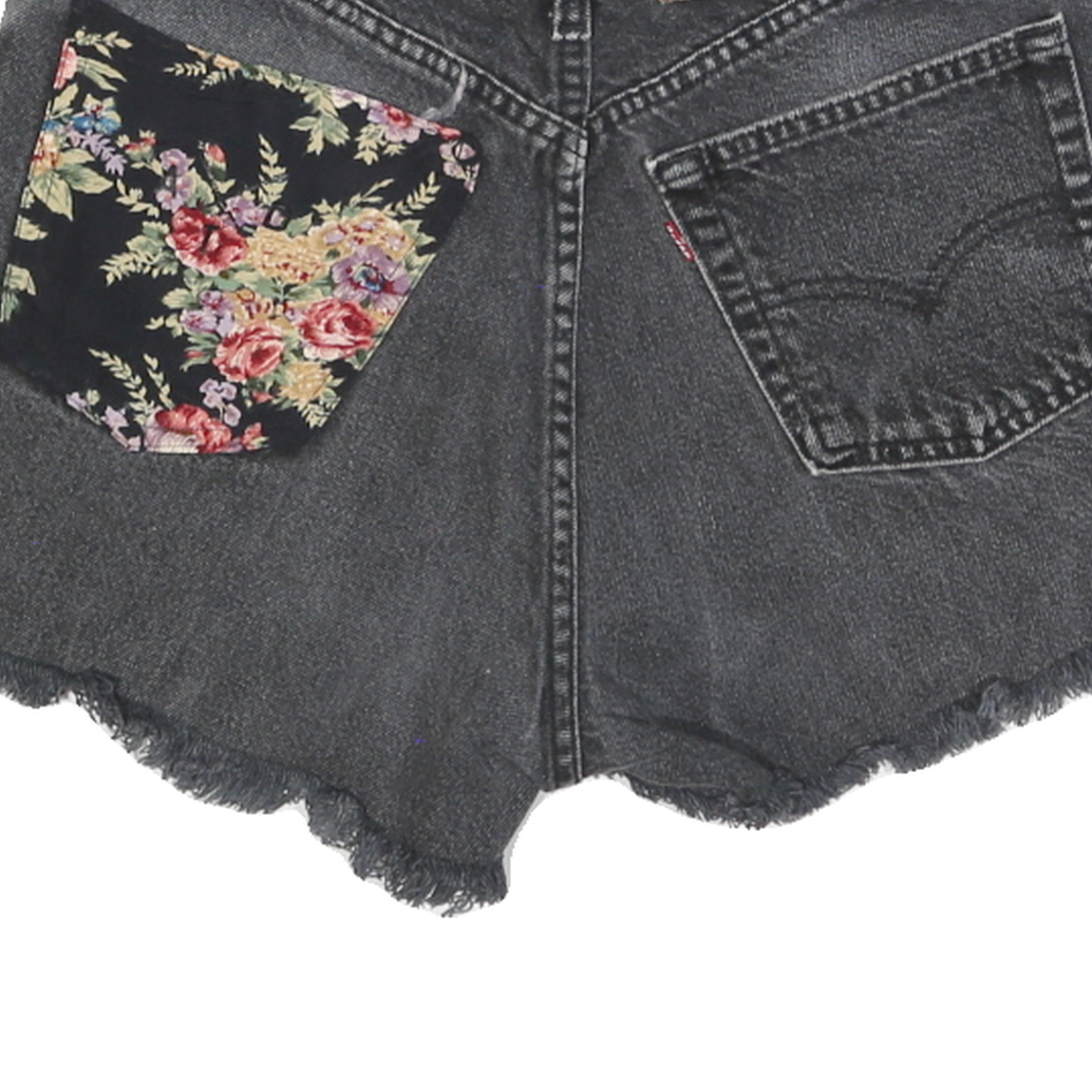 These womens Levi's black denim shorts feature a classic five-pocket design with a distinctive floral patch on one back pocket, adding a unique touch to the casual style. The fabric shows a faded black wash with a slightly worn-in look, accented by a distressed cut-off hem that creates a relaxed, summery feel.