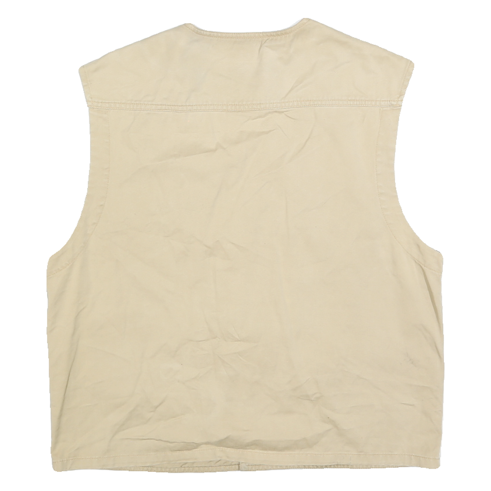 The colour is a soft beige throughout, with no visible branding or logos, making it a versatile piece that pairs well with casual or workwear outfits. The vest cut provides a comfortable fit suitable for layering over shirts or light sweaters.