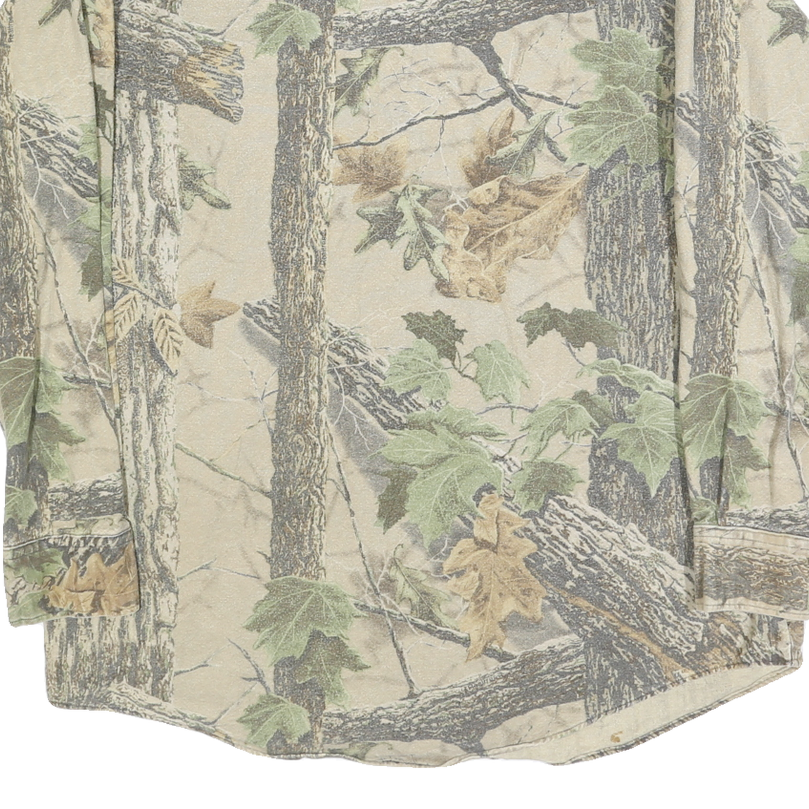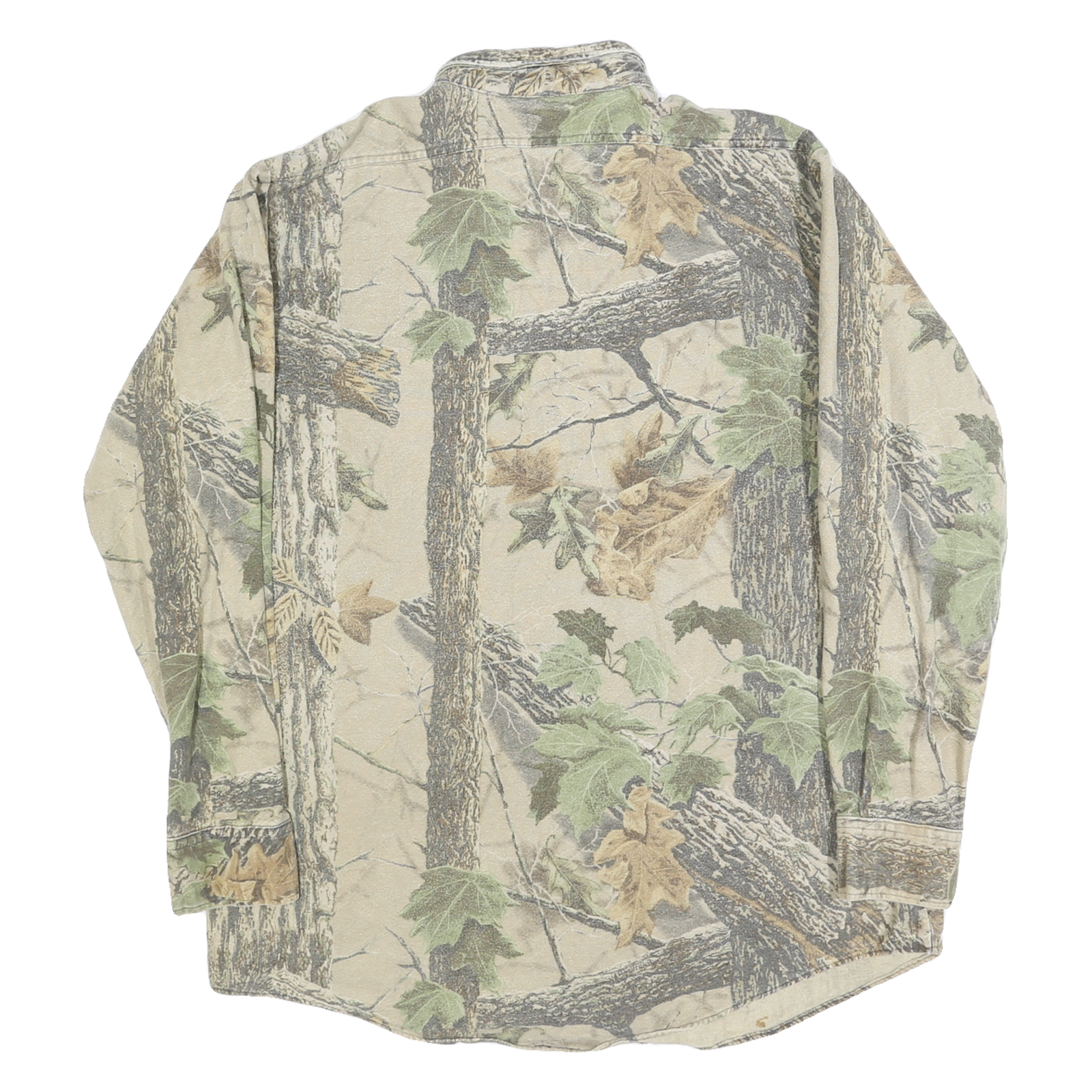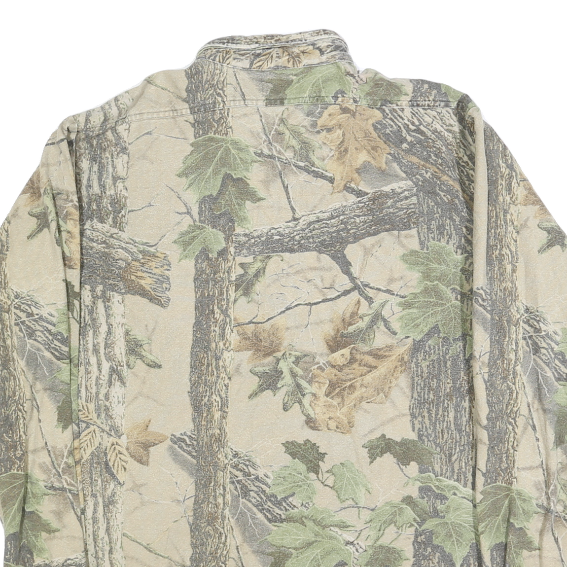 The fit is relaxed and designed for comfort with long sleeves and buttoned cuffs. The collar style is a classic point collar. This shirt showcases a unique all-over nature print that visually resembles woodland scenery, providing an outdoorsy and casual aesthetic. It has no visible branding or logos.