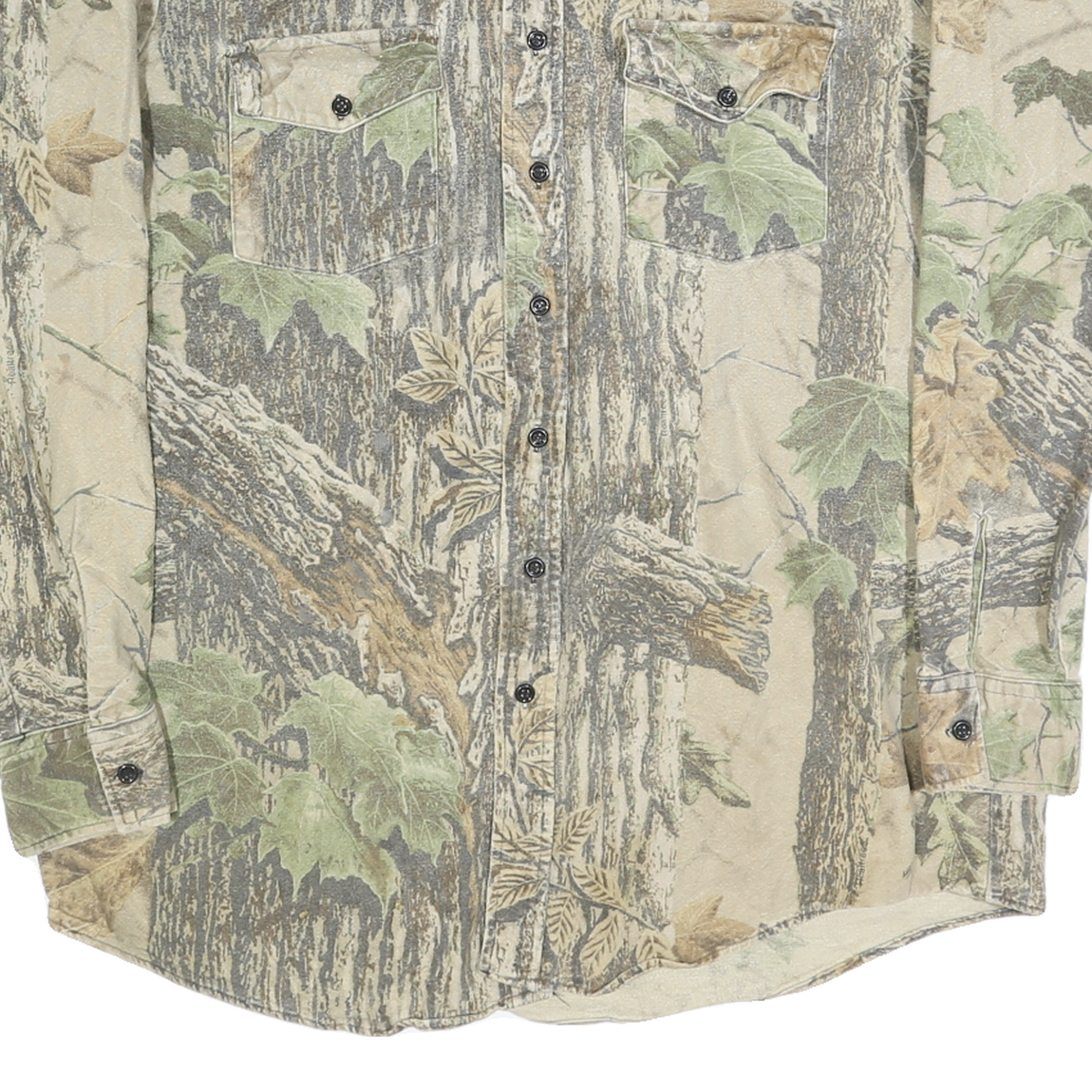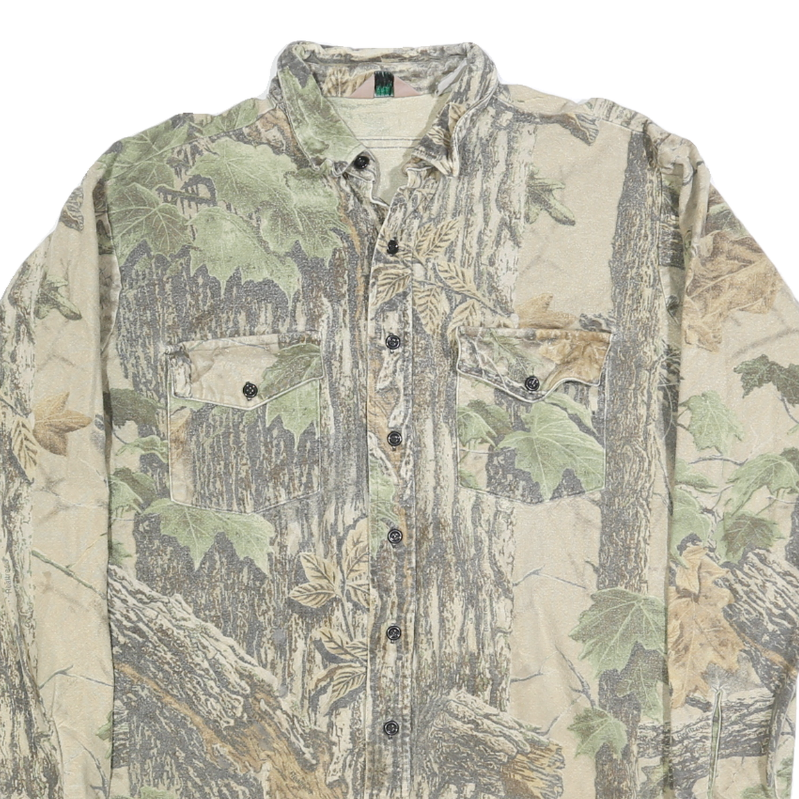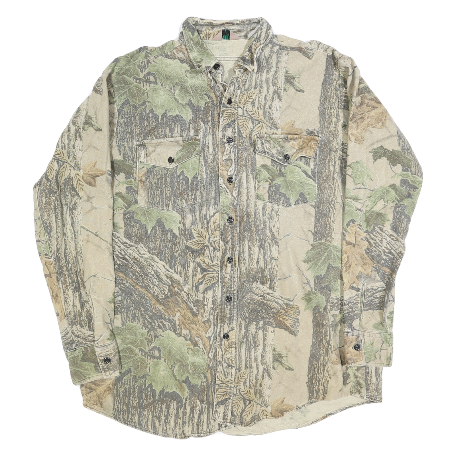 The fit is relaxed and designed for comfort with long sleeves and buttoned cuffs. The collar style is a classic point collar. This shirt showcases a unique all-over nature print that visually resembles woodland scenery, providing an outdoorsy and casual aesthetic. It has no visible branding or logos.