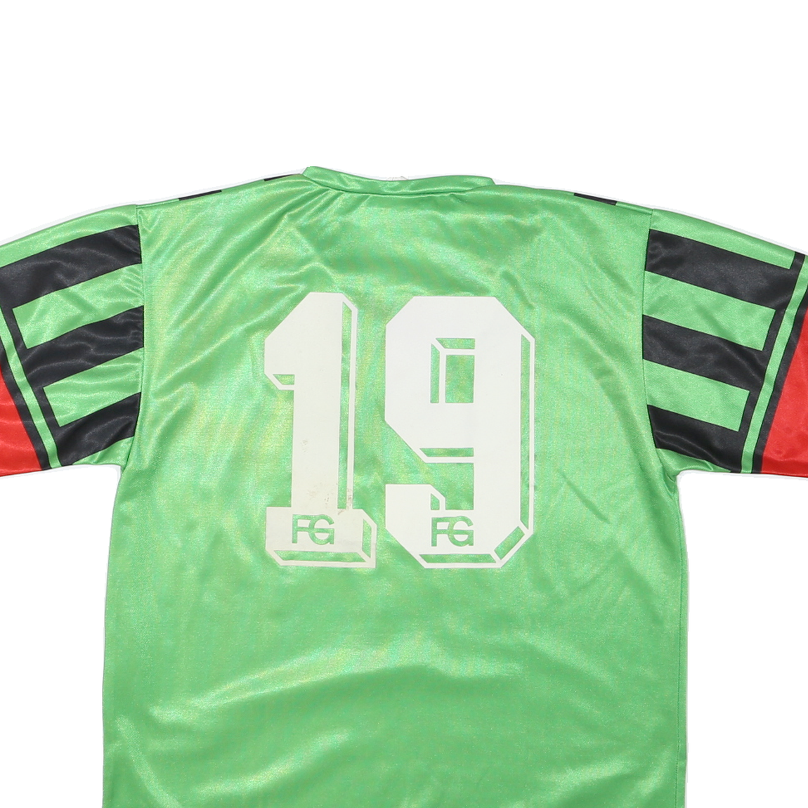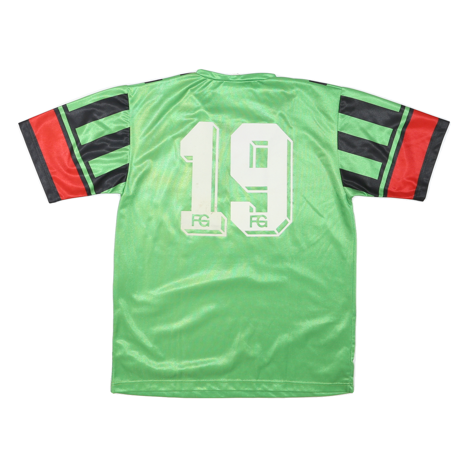 This men's sports T-shirt features a striking design with green as the primary colour, contrasted with bold black vertical stripes and red accents on the sleeves. The front includes text graphics in white with the words 'LOUP SPORT PAYERNE' and a small 'erima' logo on the chest. The back displays large white numbers '19' with additional smaller graphics at the base.