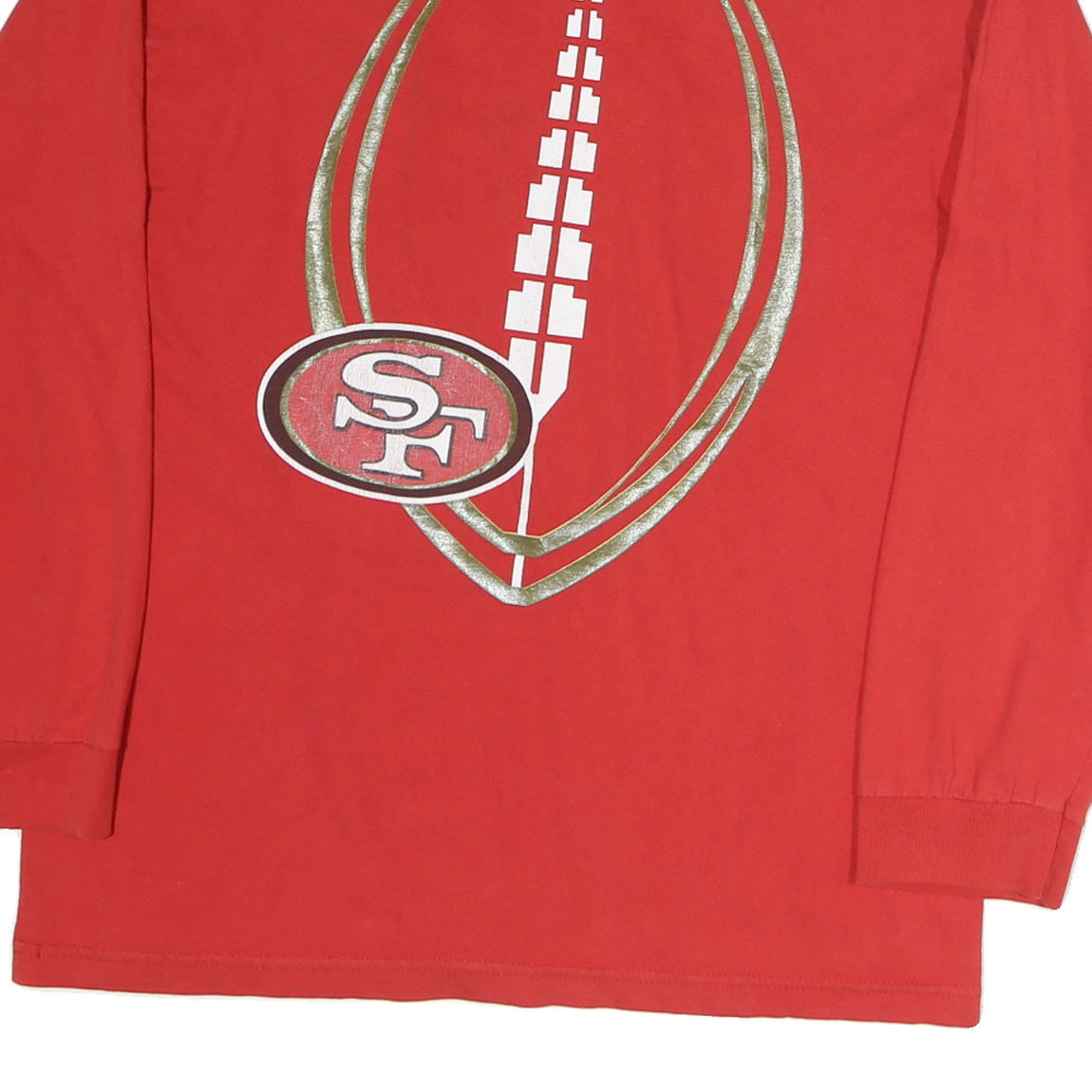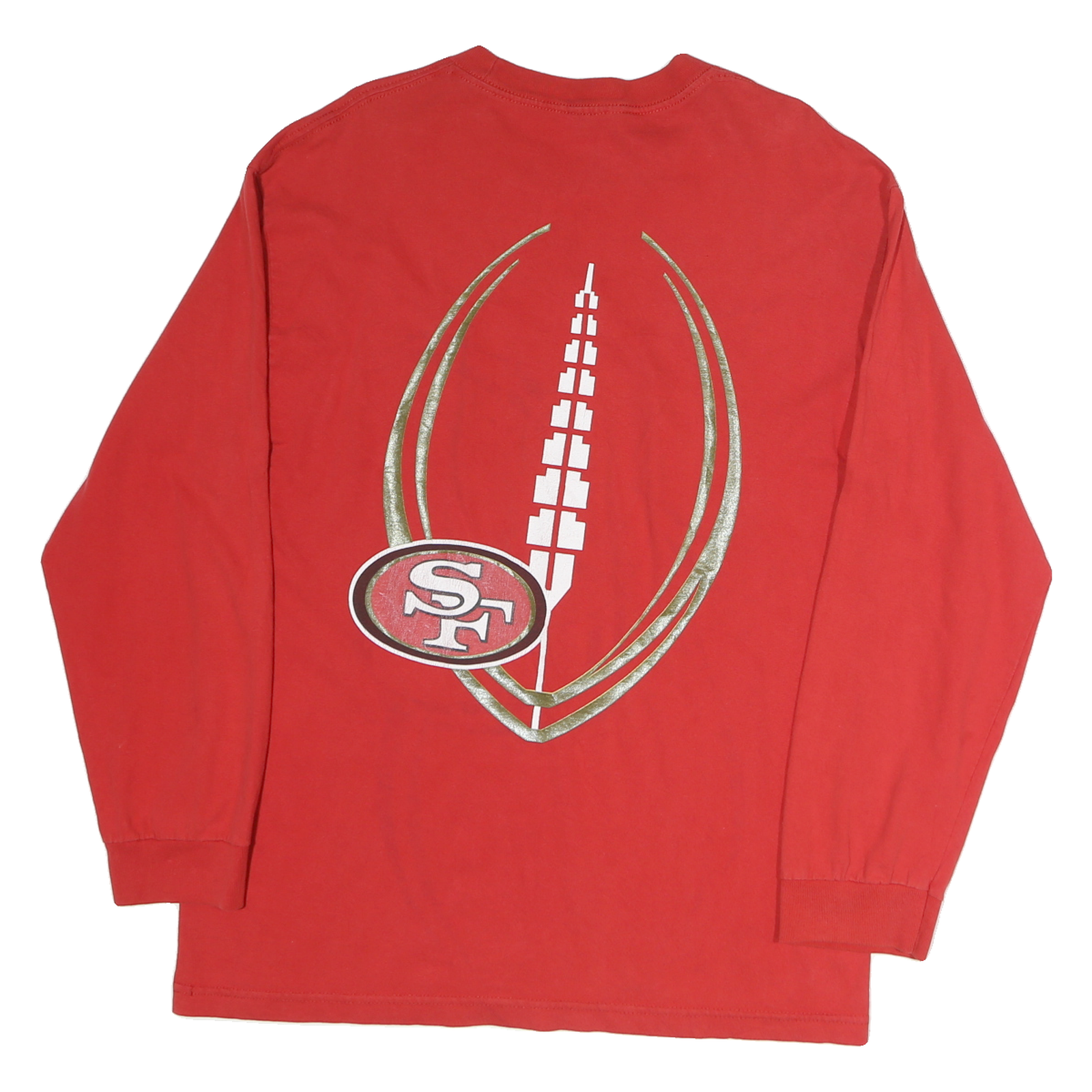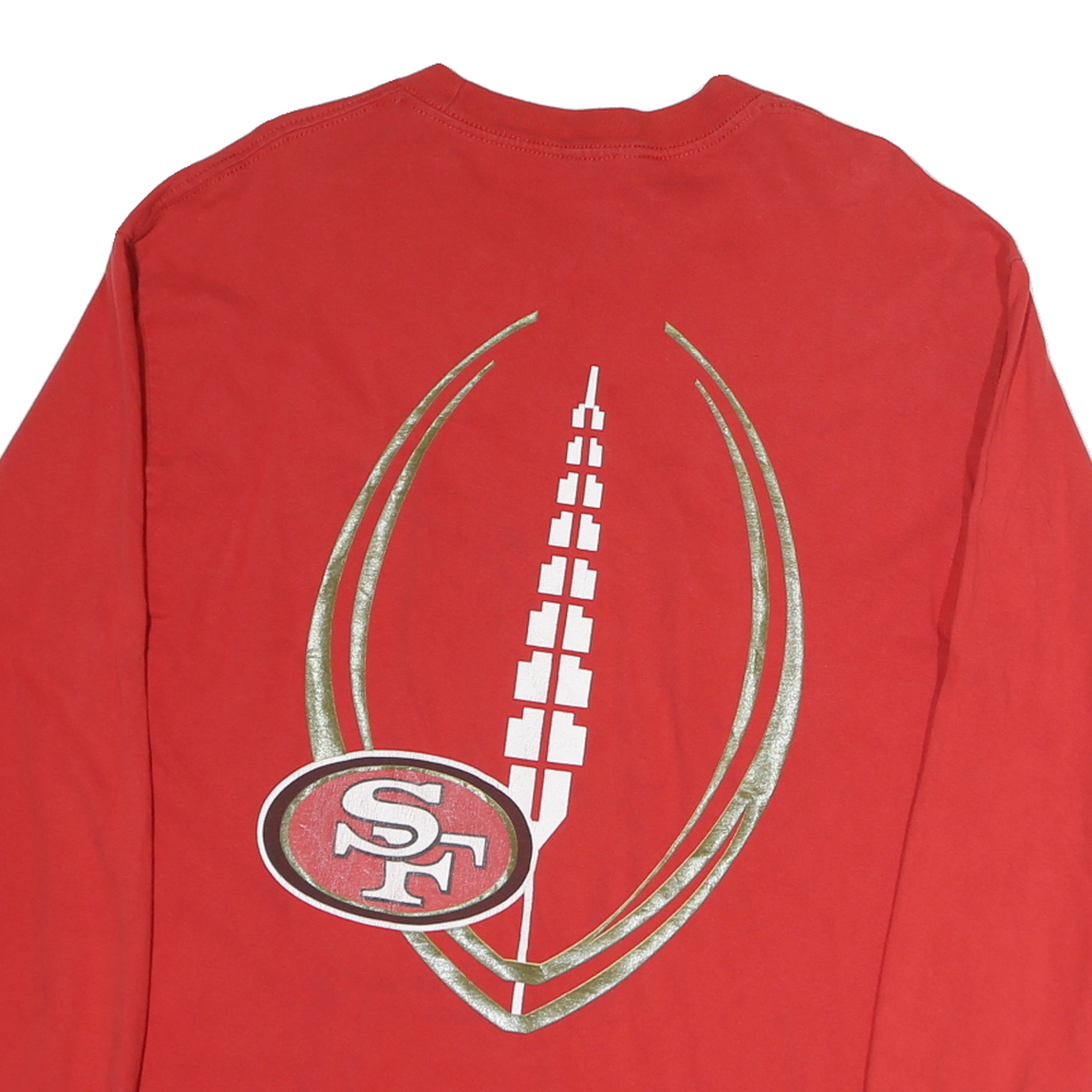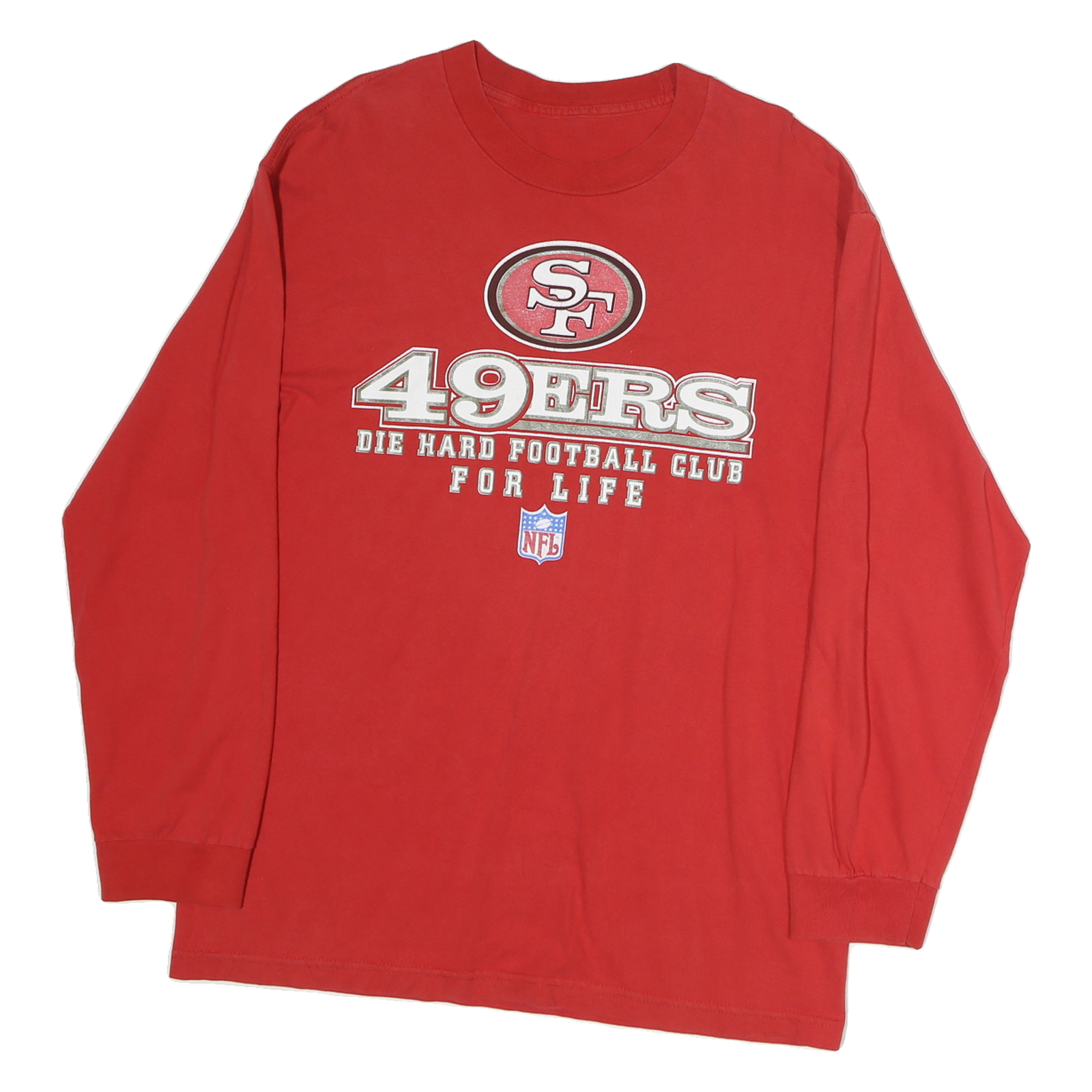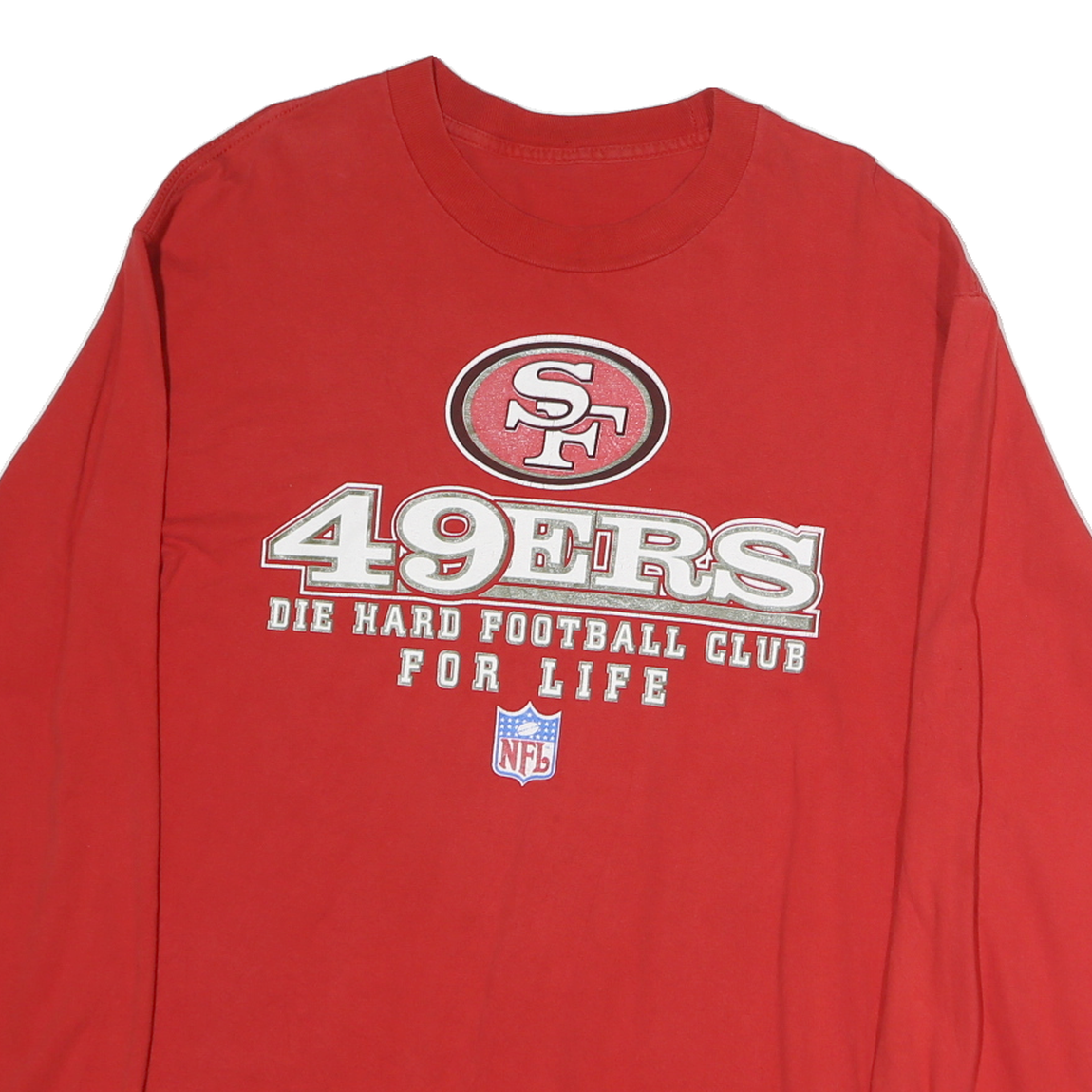 This mens red long sleeve T-shirt features bold white and silver text and logos on the front, including "49ERS" and "Die Hard Football Club For Life" along with the NFL shield. The back displays a large stylised football graphic incorporating a red SF logo. The shirt is made from soft cotton fabric for comfort and breathability, with ribbed cuffs on the sleeves and a classic crew neckline.
