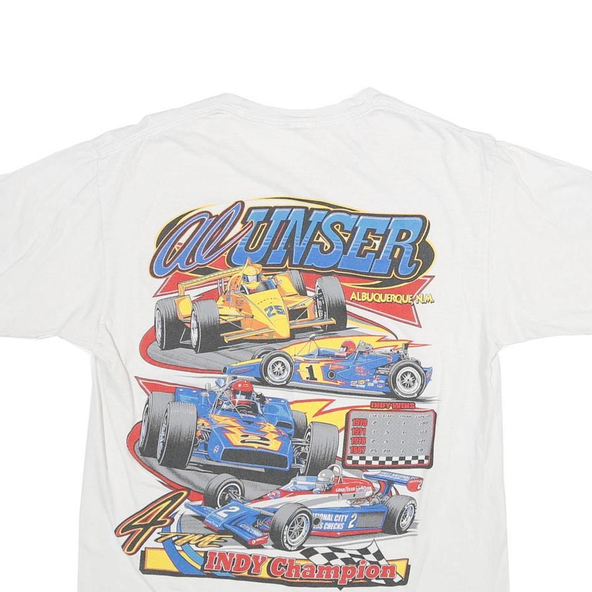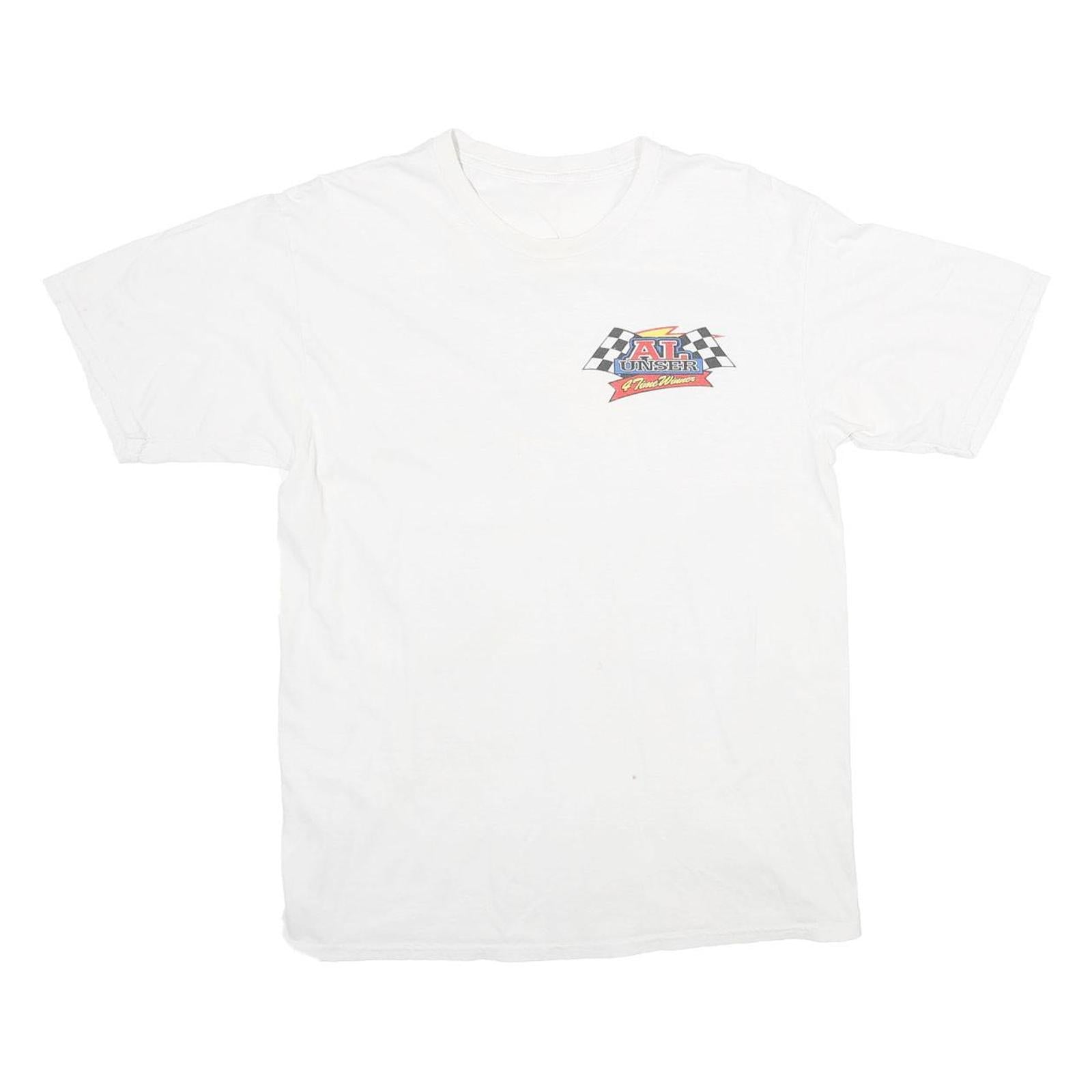 This mens white T-shirt features a bold, colourful racing graphic on the back displaying a variety of detailed race cars and the text "JUNSER" and "Indy Champion." On the front, a smaller graphic is positioned on the upper left chest with checkered flags and the name "AL UNSER." The vibrant designs stand out clearly against the plain white cotton fabric, giving a vintage motorsport vibe.