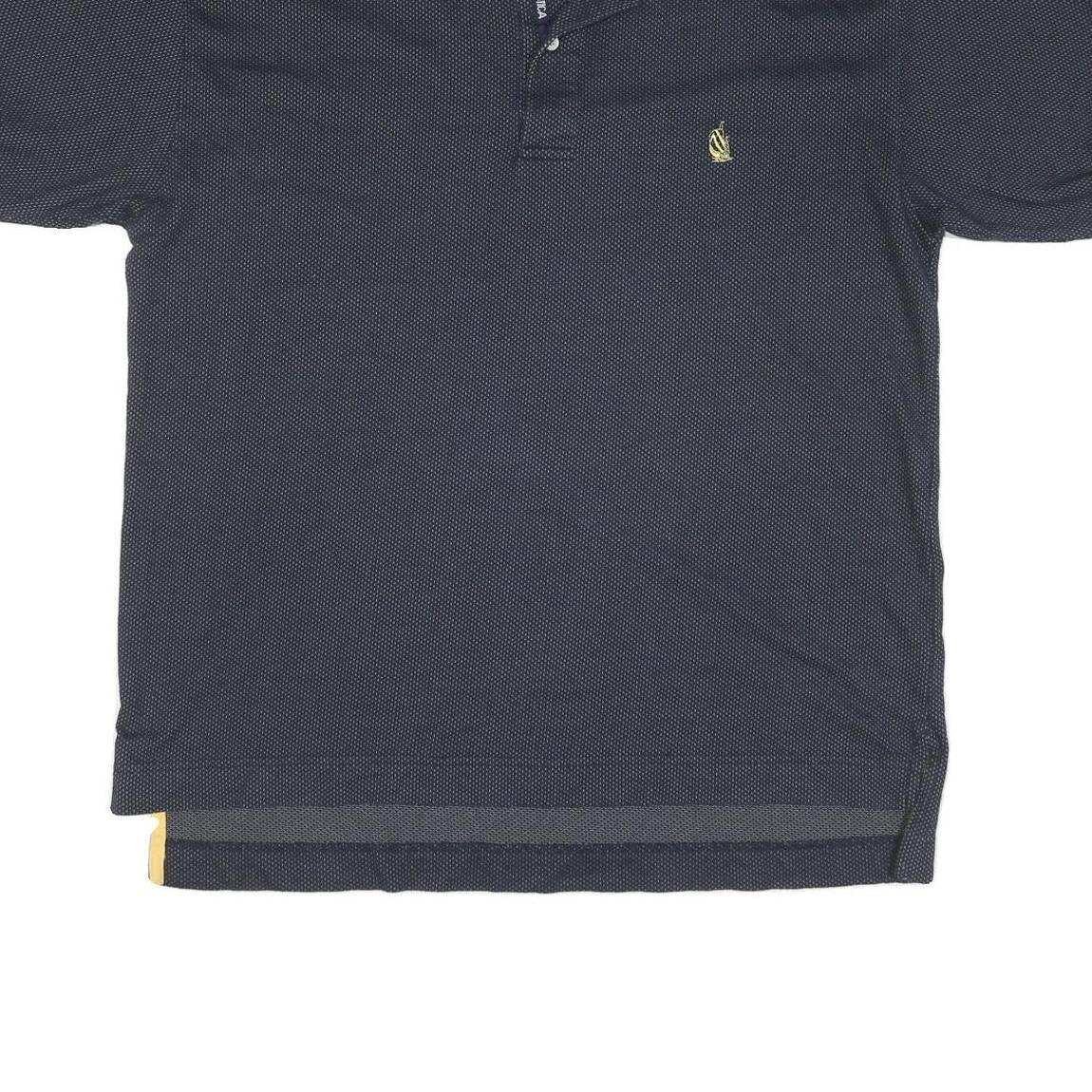 This men's polo shirt from Nautica features a deep navy blue base with subtle tiny dot texture, accented by bright yellow and navy stripes on the sleeve cuffs and yellow detailing inside the collar. The iconic Nautica sailboat logo is embroidered on the chest in yellow, offering distinctive brand recognition.