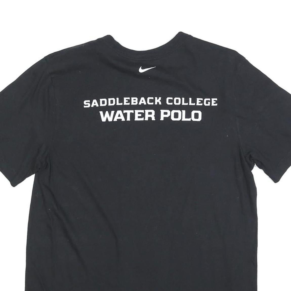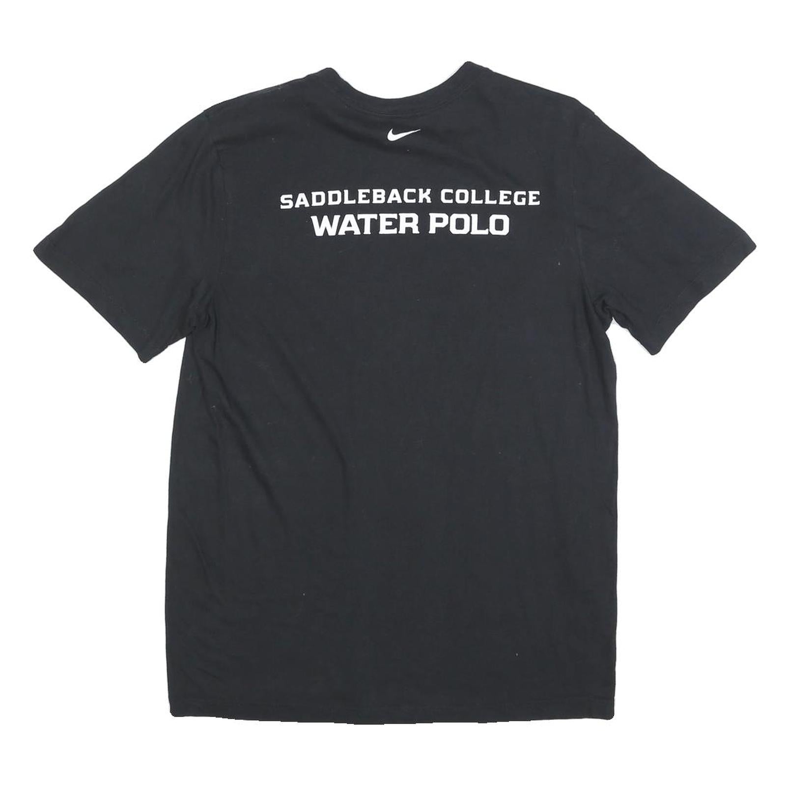 This men's T-shirt by Nike is crafted in a black cotton blend fabric, offering a comfortable and breathable fit for everyday wear. The front features a stylish white stylised 'S' graphic on the chest complemented by the Nike swoosh logo on the inner collar. On the back, bold white lettering reads "Saddleback College Water Polo" beneath another Nike swoosh, highlighting its sports team affiliation.