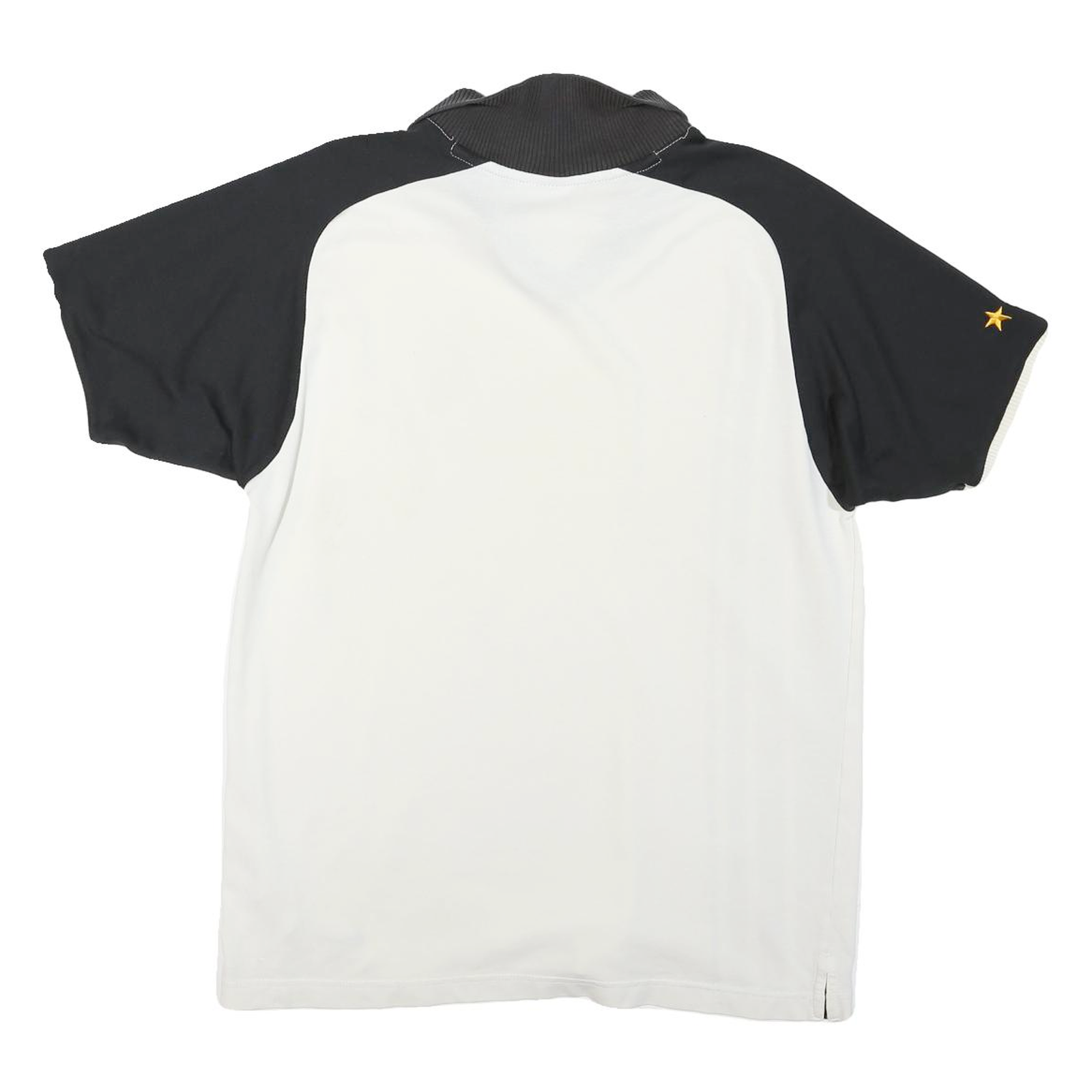 This Nike Mens T-Shirt features a striking white and black colour scheme with a Juventus badge on the chest. The front is predominantly white with black sleeves and three vertical black stripes running along one side. A subtle embroidered yellow star is present on one sleeve, adding an additional design detail.
