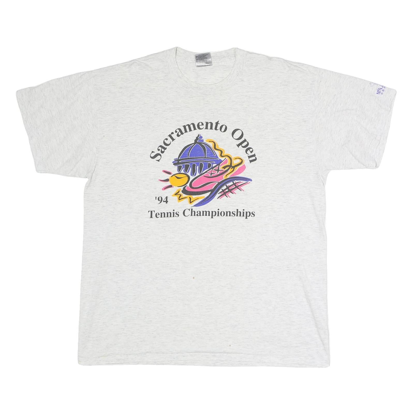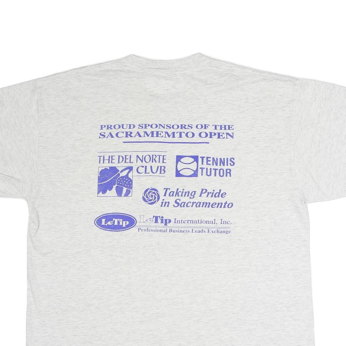 This vintage style shirt is a great piece for collectors or tennis enthusiasts, combining soft materials with period-specific graphics and branding from the 1994 Sacramento tennis event.